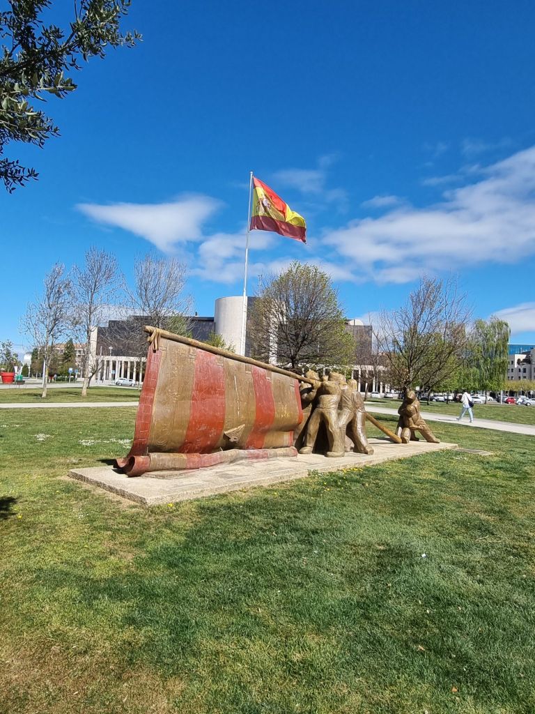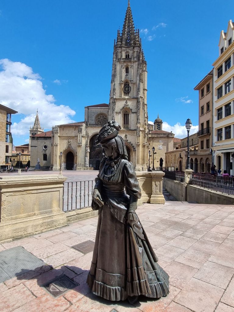 Der nächste Tag begann mit einem Stop auf dem Mirador, von wo man das Meer sehen konnte, aber auch so viel Wind war, dass man überlegen musste, bis wo frau sich hochkämpft, ohne weggeweht zu werden. Auch an diesem Aussichtspunkt gab es frische Blumen am Denkmal für die Kämpfenden des spanischen Bürgerkriegs. Von dort ging es mit einem kurzem Stopp in Gjion (mit einem mäßigen Essen in einer Touristen-Sideria) nach Orviedo. Hier gab es zwei Stunden Sightseeing ohne Begleitung. Eine gute Gelegenheit, einfach durch die Stadt zu bummeln und nach den vielen Skulpturen Ausschau zu halten, die dort überall aufgestellt sind. Ich fand La Regenta am Wichtigsten, manche suchen lieber die von Woody Allen. Und dann ging noch nach Leon, wo es einen freien Abend gab. Das Hotel war ok, allerdings ist ein einziger kleiner Fahrstuhl in einem Hotel mit vielen Stockwerken eine echte Herausforderung bei der An- und Abreise von Reisegruppen.