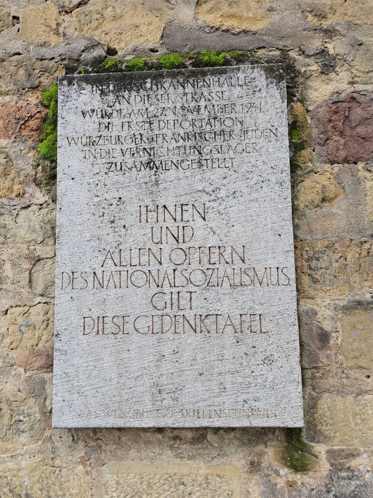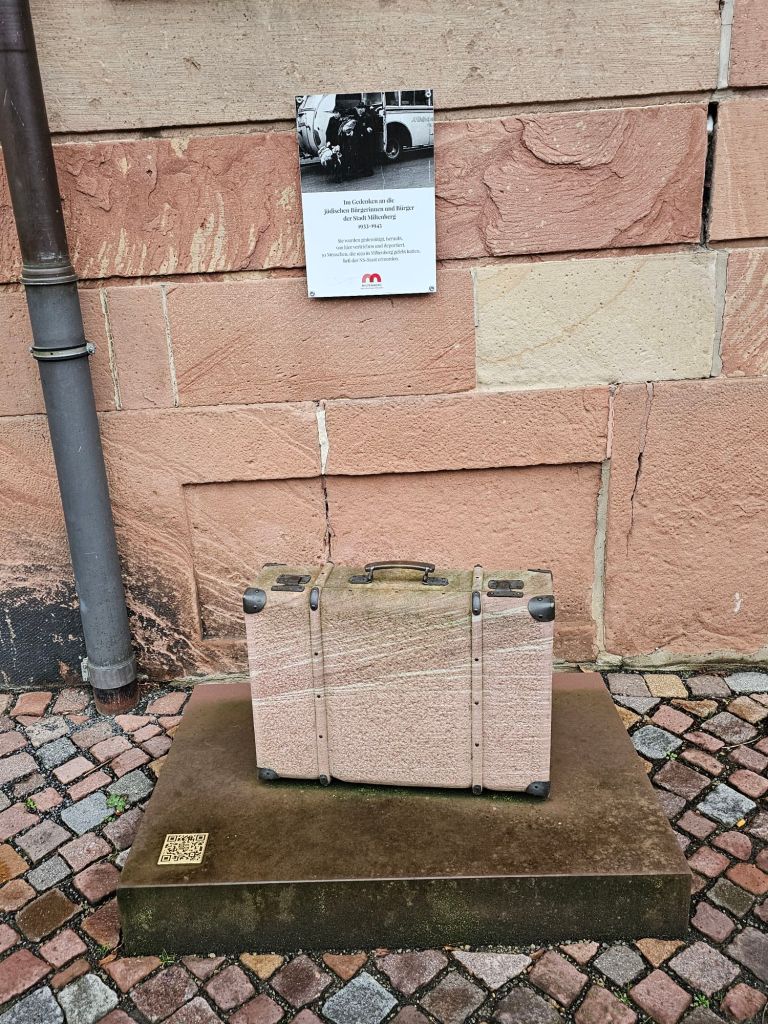 Für alle drei Anlaufstellen brauchte man keinen gebuchten Ausflug. An der Rezeption gab es für jeden Ort auch einen kleinen Stadtplan, aber insgesamt sind Wertheim und Miltenberg so übersichtlich, dass man einfach durch den Ort bummeln kann – und auch in Würzburg kommt man gut zu Fuss durch die historische Innenstadt. Ich habe viele schöne alte Häuser gesehen. Interessant, dass an allen drei Orten Stolpersteine und zum Teil Interessante Gedenktafeln für die verfolgten jüdischen Bürger*innen gab. In Würzburg lagen Stolpersteine und eine Gedenktafel für die frühere Synagoge direkt gegenüber einer großen katholischen Kirche. Und in Miltenberg war ein sehr neuer Gedenkort am Rathaus zu finden. Die gewählten Inschriften tun sich schwer mit der Benennung der Täter des Holocaust, aber immerhin das jüdische Leben in diesen Orten wieder sichtbar.