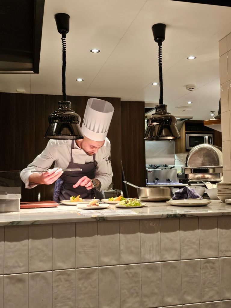 Das Frühstücksbuffet mit aufgebackenen Brötchen ist eher auf dem Niveau eines einfacheren Hotelfrühstücks ohne besondere Highlights. Der Kaffee aus der Kanne kommt durch die Servicekräfte, der Orangensaft aus dem Tetrapack. Wenn man Mittags an Bord ist, kann man die kleine Karte im Bistro mit frisch zubereiteten Burgern, Fish and Chips oder Suppe und Salat genießen oder ein Vorspeisen- und Salat-Buffet sowie eine Auswahl von Gerichten, die am Platz im Hauptrestaurant serviert werden. Das Essen ist ordentlich, aber nicht spektakulär. Das Abendessen im Bistro ist etwas, dass man auf jeden Fall reservieren sollte, um es zu genießen. Sechs Tische, ein Kellner, ein Koch in der offenen Küche. Definitiv mein Highlight dieser Reise. Am Abend des Galadinner am letzten Abend gab es eigentlich nur die Wahl zwischen (sehr leckerem) Fleisch und einer vegetarischen Alternative für den Hauptgang. Der Kellner, der das aufnahm, fiel mir eh schon auf der Reise durch konsequentes Duzen der Gäste auf, hatte aber kein Ohr für meinen Wunsch, die beiden fischhaltigen Alternativen durch etwas ohne Meeresgetier zu ersetzen. Zum Glück hat das dann mein Lieblingskellner beim Servieren glattgezogen, so dass ich das volle Programm hatte.