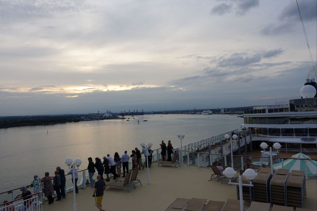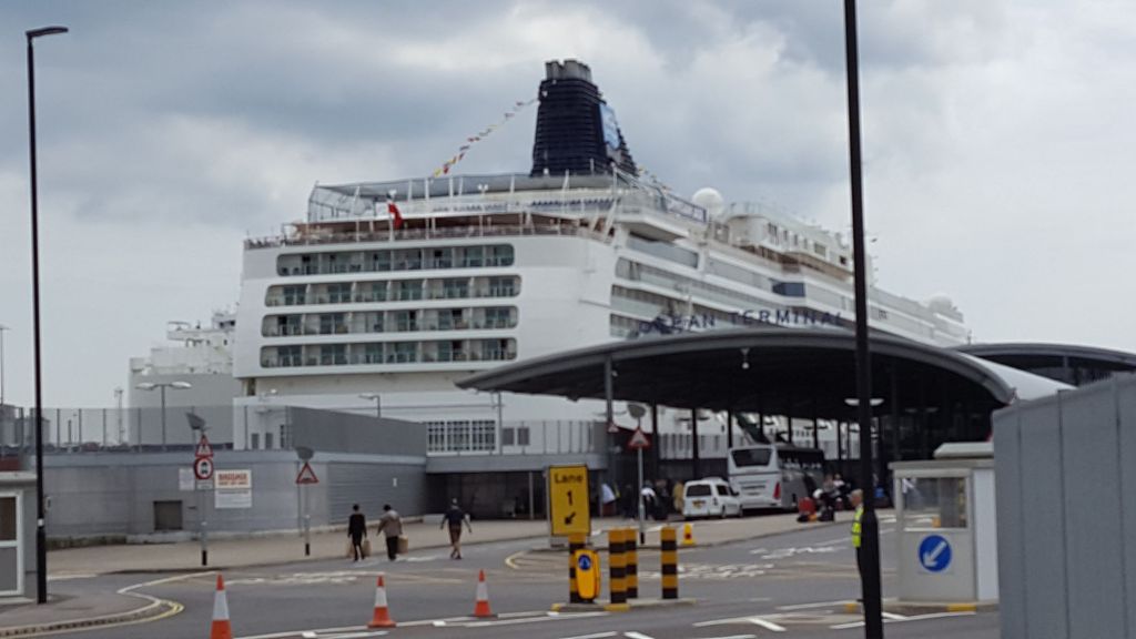 Damals bin ich einfach in der Wärme eines Juni-Mittags in Südengland zu Fuss mit meinem kleinen Koffer losgelaufen und habe in einem grossen Hafengelände mit damals drei Kreuzfahrtschiffen, die da auf Passagiere warteten, und das auf motorisierten Zugang der Menschen und zu verladenen Güter zu und von den Schiffen ausgelegt ist, in einer guten halben Stunde zum Ocean-Terminal und meinem Schiff gefunden.