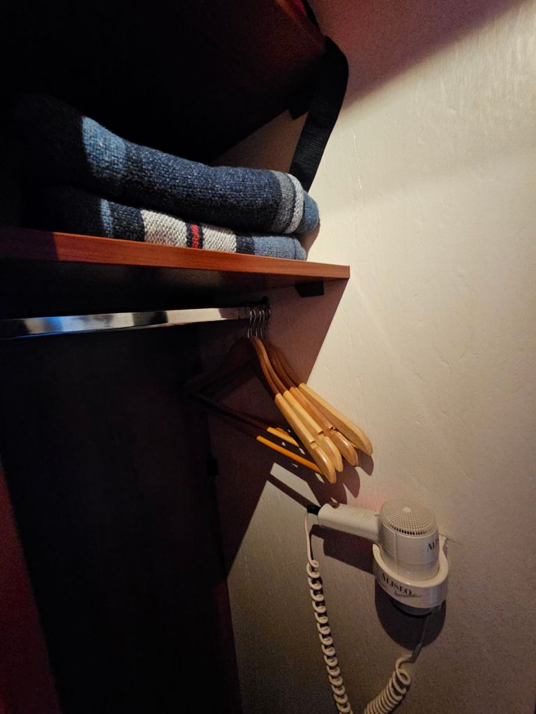 Es gibt auch auf diesem Schiff Decken für das kleine Nickerchen auf dem Bett und die bisher seltsamste Anordnung des Föhn in einer Kabine – hier soll man sich stehend im Kleiderschrank die Haare trocknen.