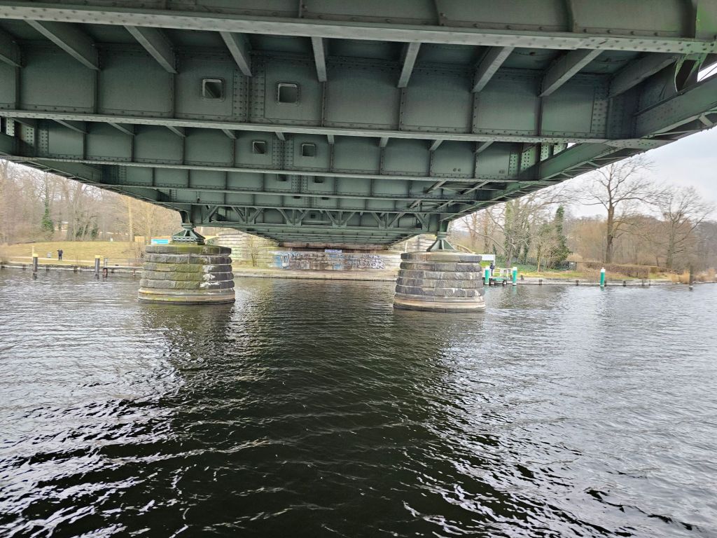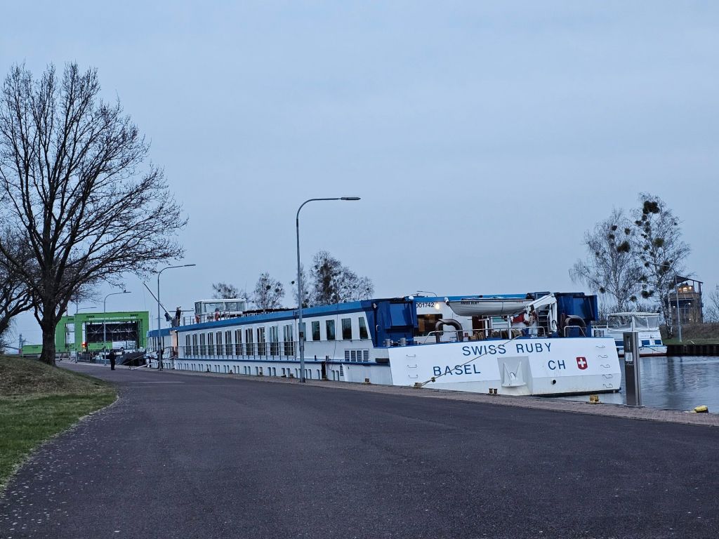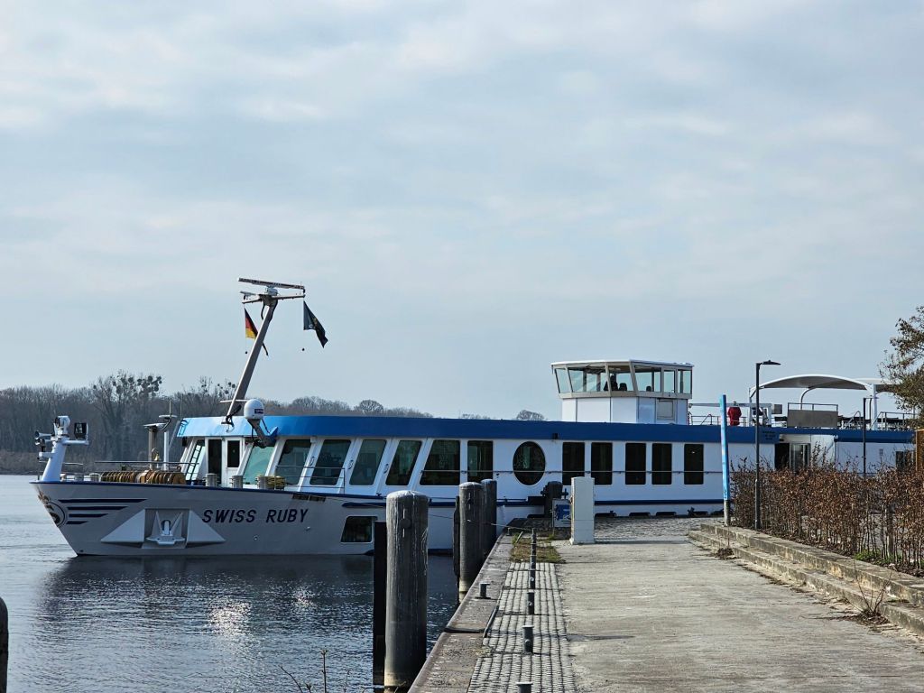 Flusskreuzfahrtschiffe können auch ohne besondere Hafenanlagen am Ufer von Flüssen anlegen. In Berlin starten die Schiffe am Spandauer Schifffahrtsufer. Es ist ein 10-minütiger Fussweg vom Fern- und U-Bahnhof Spandau. Es ist, zumal in der Frühlingssonne, ein schöner Spaziergang am Wasser entlang. Man muss allerdings auch ein paar Treppen überwinden. So merkt man schon von Beginn an, dass eine Flusskreuzfahrt nichts für stark mobilitätseingeschränkte Personen ist – man sollte Treppen steigen können und halbwegs gut zu Fuß sein.