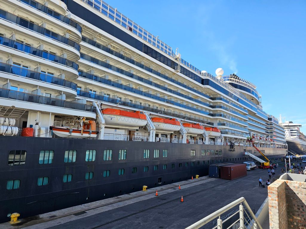 Als ich am Donnerstag vormittags vom Flughafen zum Hotel fuhr, hatte ich mich schon gewundert, warum die Queen Victoria, die schon ab Donnerstag früh im Hafen liegen sollte, nicht zu sehen war und nur ein Viking-Schiff im Hafen lag. Da ich ja dank Hotel-WLAN im Netz surfen konnte, fand ich – durch ein Gruppenmitglied – in der entsprechenden Facebookgruppe regelmäßige Updates, dass die Queen Victoria aufgrund der Winde, die an Land zwar vorhanden, aber nicht so heftig waren, nicht wie geplant am Donnerstag in den Hafen einlaufen konnte – und stattdessen vor Kapstadt kreiste.