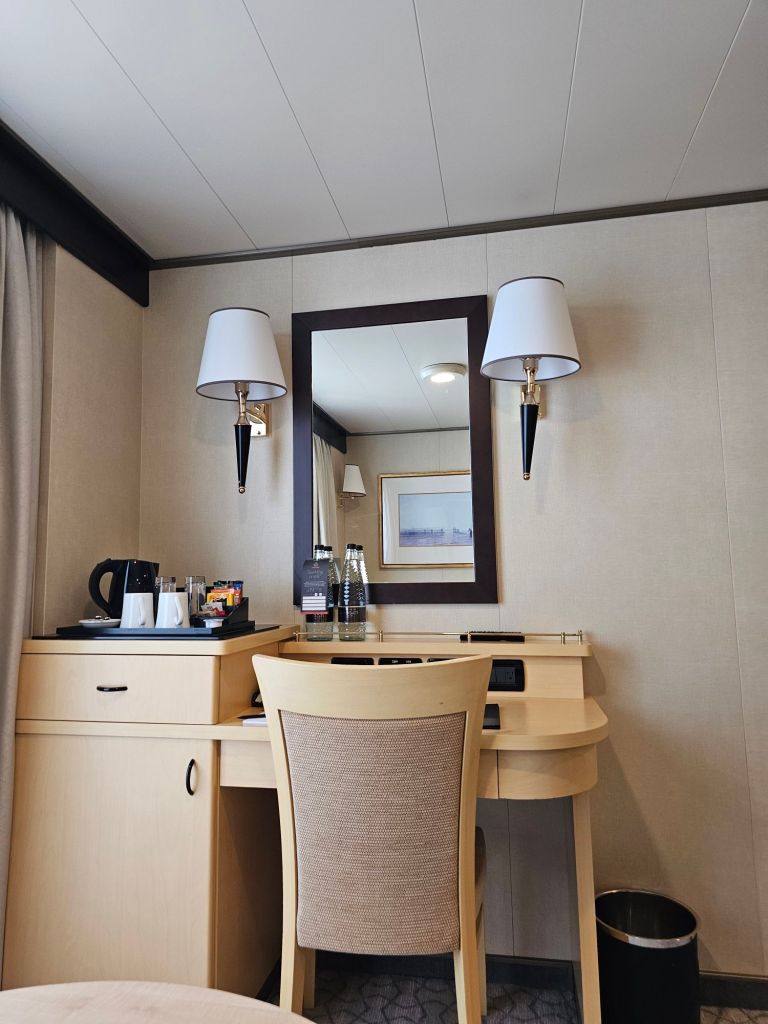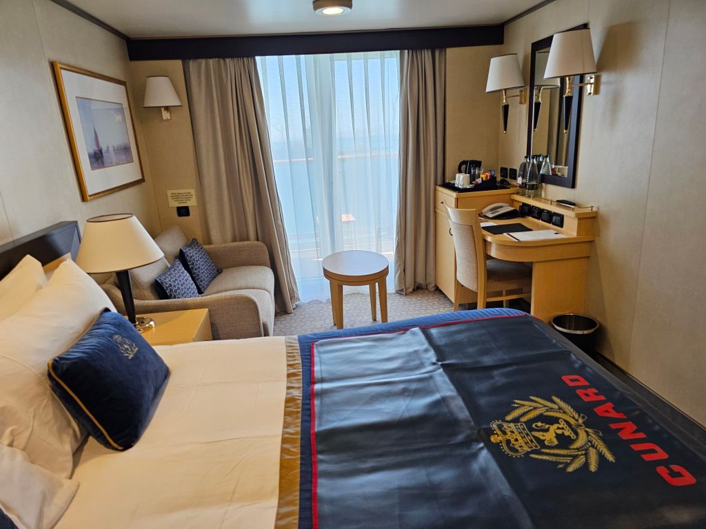 Es ist eine helle Balkonkabine, gut gepflegt. Allerdings merkt man das Baujahr der Queen Victoria, die seit dem Stapellauf 2007 für Cunard fährt, vor allem daran, wie wenig Steckdosen in der Kabine sind: keine Steckdosen am Bett, keine USB-Anschlüsse. Vier Steckdosen – Euro-, UK- und US-Format am Schreibtisch. Ausserdem gibt es zwar drei Kleiderstangen in den drei Schränken, aber ziemlich wenig Platz für alles, was nicht hängt. An beiden Seiten des Bettes gibt es zwei Nachttische mit jeweils drei Schubladen, in denen übliche Packwürfel nur etwas hineingequetscht passen und fünf Bretter in den Schränken.