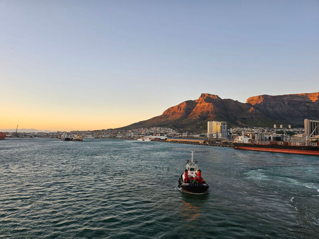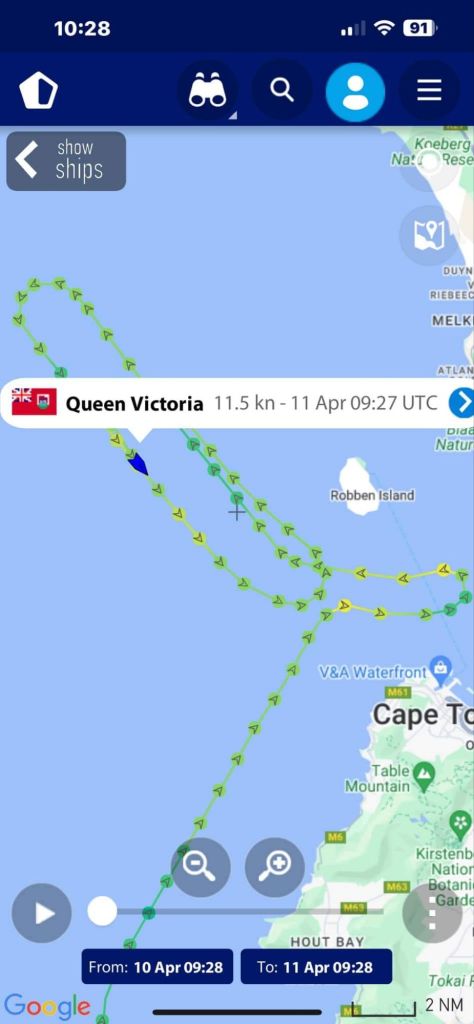 Cunard hat seine Gäste nicht weiter informiert, aber immerhin gab es Donnerstag Abend eine Mail, dass man, so man einmal auf dem Schiff ist, es nicht noch einmal für einen letzten Landgang verlassen kann. So hatte ich zumindest die Gewissheit, dass sie wissen, dass ich in Kapstadt an Bord will und wie sie mich im Zweifel erreichen können. Und ein Blick in einen Cruise-Tracker am Freitag Morgen zeigte: beide Queens – die Victoria und die Mary2 – liegen im Hafen von Kapstadt.