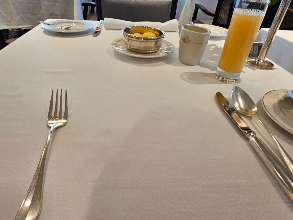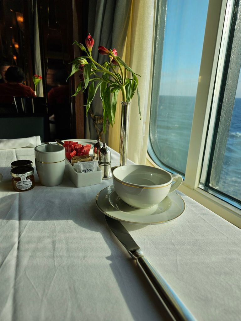 An einem Morgen beim Frühstück waren Tassen eingedeckt, die zu groß für den Tassenspiegel der Untertasse waren und nur an einem von zwei Plätzen gab es einen kleinen Teller mit Buttermesser. Man hat den Eindruck, es gäbe kurzzeitig immer wieder Probleme mit der Verfügbarkeit des Cunard-Geschirrs – und zudem fehlt eine regelmäßige Qualitätskontrolle des eingedeckten Geschirr. Das verwendete Geschirr auf der Queen Victoria wurde schon sehr oft benutzt – man sieht es ihm an.