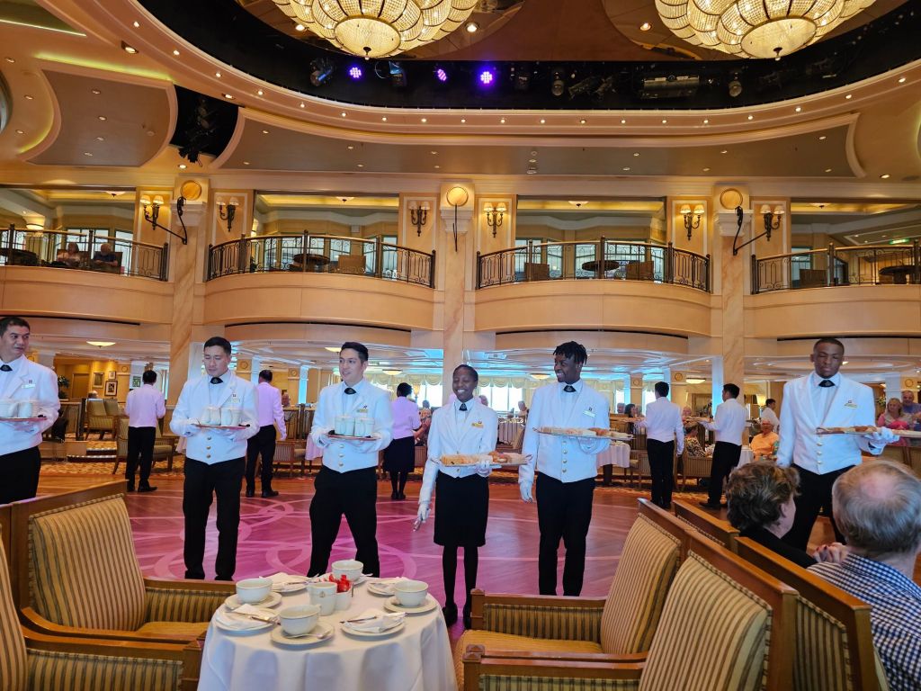 Cunard betont seinen besonderen „White Star Service“. Und ja, ganz überwiegend ist der am Gast beobachtbare Service gut. Das ist umso wichtiger, als die Crew Mitarbeitende aus vielen Nationen hat und die Ausbildung im Bereich Hotel-Gastronomie überall auf der Welt unterschiedlich organisiert ist. Das auf den Cunard-Schiffen zu einem einheitlichen Auftritt zu bringen ist sicher schon normalerweise eine gewisse Herausforderung, aber mit einem vierten neuen Schiff, dass nach seinem sehr erwarteten Start im Gästebetrieb in wenigen Tagen mit gut trainiertem Personal besetzt werden muss, sicher eine besondere Anstrengung. Es waren viele neue, junge Leute neben erfahrenen Kräften im Service und ihre Anstregungen, zum Beispiel bei der Teatime den französischen Service (das Servieren von Servierplatten) auch bei kniffligen Aufgaben (z.B. die Clotted Cream im kleinen Porzellanschälchen mit Löffel und Gabel auf den Teller des Gastes zu bringen) zu meistern, zu beobachten, war fein – und sie haben es meist gut geschafft, obwohl ihnen noch die Selbstverständlichkeit der oftmaligen Anwendung der Fähigkeiten fehlte.