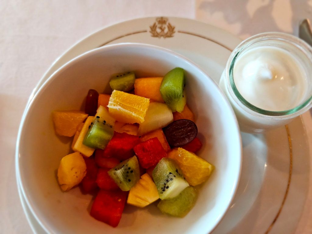 Ein wichtiger Bestandteil einer Kreuzfahrt ist das Essen. Es gibt eigentlich zu jeder Tageszeit etwas zu essen, für den eher unwahrscheinlichen Fall, dass man hungrig ist. Es braucht auch keine Depots in der Kabine. Der Kabinenservice liefert 24 Stunden von einer kleinen Karte.