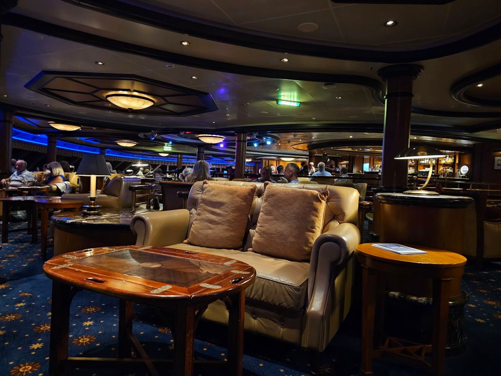 Es gibt viele verschiedene Bars an Bord der Queen Victoria – ich mag am liebsten den Commodore Club auf Deck 10. Ein wunderbarer Ort, um mit Blick nach vorne in bequemen Sesseln zu sitzen, einen Cocktail zu trinken und dabei Barmusik zu hören.