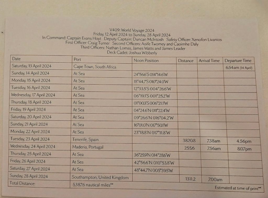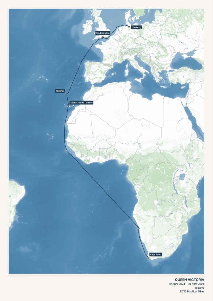 Die Reise ist der letzte Streckenabschnitt der Weltreise 2024 der Queen Victoria, die im Januar 2024 in Hamburg (bzw. Southampton) gestartet ist und die nach vier Monaten in Hamburg (bzw. Southampton) endet. Diese Teilstrecke dauert 18 Nächte und hatte geplant nur 4 Landtage und 8 Seetage am Stück von Walvis Bay nach Teneriffa. Aufgrund der durch das Wetter, genauer der Winde, in Kapstadt um über 12 Stunden verspäteten Abfahrt von dort wurde am Montag durch den Kapitän der Anlauf nach Walvis Bay gestrichen, um die Verspätung bis Teneriffa wieder aufzuholen. Es gab es nur einen kurzen Stop am Abend vor Walvis Bay, um Passagiere von einem längeren Ausflug und neue Gastkünstler per Tender aufzunehmen – und damit 10 Seetage am Stück von Kapstadt nach Teneriffa. Von dort geht es weiter nach Madeira, mit drei weiteren Seetagen nach Southampton und dann endet nach einem weiteren Seetag diese Reise in Hamburg.