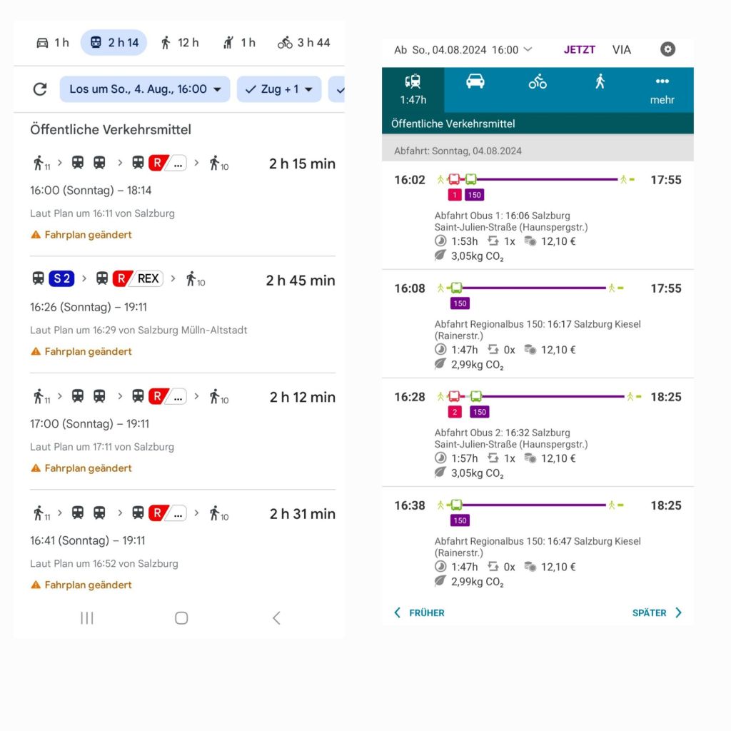1. Googlemaps bildet für Salzburg und das Salzkammergut nur einen Teil der ÖPNV und Regionalverkehrsinformationen ab. So wird für die Strecke Salzburg – Bad Ischl nur die Bahnverbindung mit mehrfachem Umsteigen angezeigt, wohingegen die Salzburgverkehr-App auch auf die schnellere und umsteigefreie Regionalbusvariante verweist.