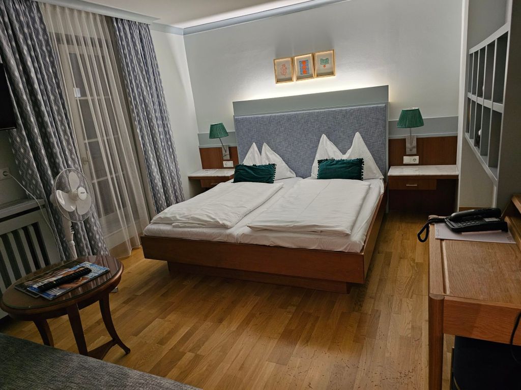 Bisher bin ich immer bei meinen Besuchen in Vöcklabruck, vor allem Mittwoch während des Wochenmarktes, auf dem Stadtplatz am Auerhahn vorbei gelaufen. Das Hotel ist seit fünf Generationen im Familienbesitz, ziemlich verbaut und die Zimmer sind eine Zeitreise in die 80iger Jahre. Ich hatte ein Einzelzimmer mit Einzelbett, einem ziemlich gebrauchten Schrank in einem kleinen Vorraum und einer extrem kleinen grün gekachelten Nasszelle, in der man sich auf die Toilette am Waschbecken vorbei schlängeln muss. Es war sauber und etwas laut, aber es ging für eine Nacht. Beim Frühstücksbüffet steht zu Recht ein Tischabfalleimer auf dem Tisch, denn ich habe schon lange nicht mehr so viele plastikverpackte Bestandteile auf einem Frühstücksbüffet gesehen.