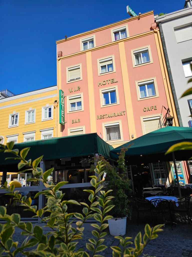 Am Abschluss dieser Reise habe ich (zum ersten Mal) in Vöcklabruck übernachtet – im Hotel Zum Auerhahn am Stadtplatz. Da ich jetzt keinen festen Standort mehr habe, probiere ich mich durch all die Orte, die ich seit vielen Jahren kenne und in denen ich nie „drinnen“ war. Ich habe ein Hotel gesucht, von dem ich es nach dem Familientag am Sonnabend am Sonntag nah zu einem Bahnhof mit einer guten Bahnverbindung nach Berlin habe. Da ist Vöcklabruck – Haltepunkt für ÖBB und Westbahn – ein guter Startpunkt – mit Umsteigen in Salzburg und München.