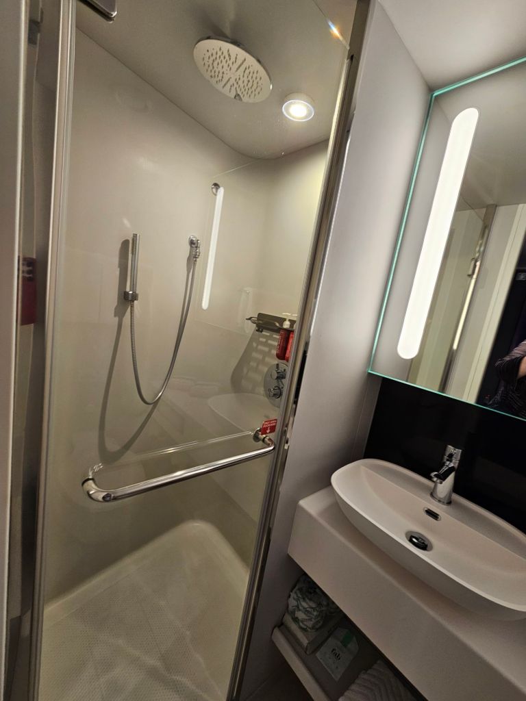 Das Badezimmer ist eher klein und mit sehr wenig Platz, auch in der Dusche (mit Glastür) muss man aufpassen, dass man nicht als Erstes die Regenschauerdusche ansteuert (mit sehr schlecht sichtbaren Hinweisen an der Armatur) um sich nicht ungeplant die Haare zu waschen oder ohne Sicherheitsabstand die Temperatur des Wassers zu checken. In meiner Kabine war auch zunächst kein Föhn, der wurde aber binnen 30 Minuten nach einer Nachricht an den Sailor Service in die Kabine gebracht. Allerdings hatte ich zu diesem Zeitpunkt zum Glück keinen Termin, den ich erreichen wollte.