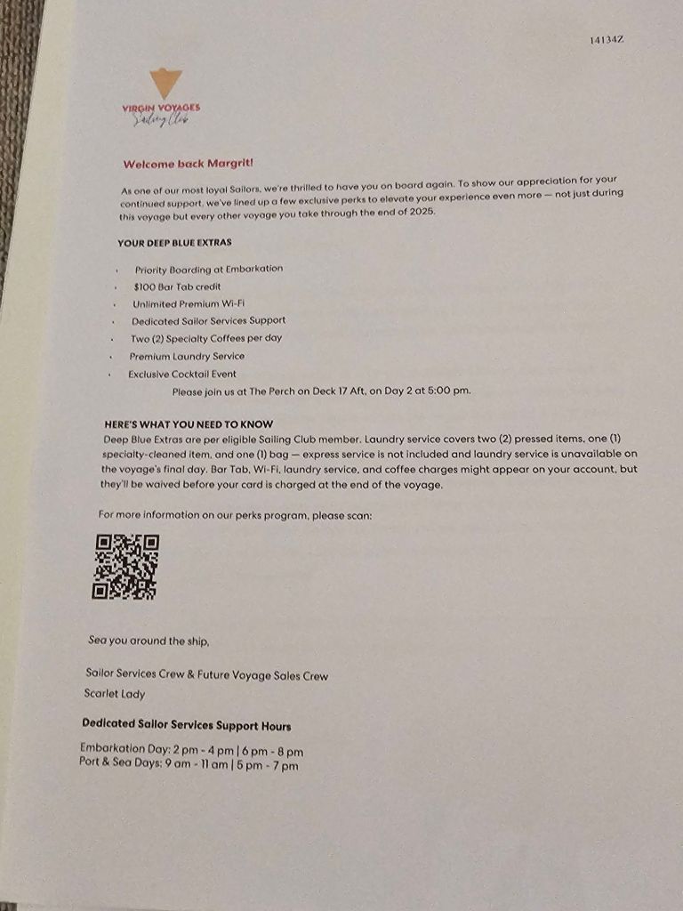 Neugierig hat mich das Konzept von Richard Branson gemacht, weil es gutes Essen, eine andere Form der Reise auf einem Kreuzfahrtschiff, einen anderen Ansatz beim Personal und eine andere Form der Bordunterhaltung verspricht – und ein ziemliches Kontrastprogramm zu Cunard mit deren Art, Kreuzfahrten zu gestalten. Das Cunard-Reisenden nicht zugetraut wird, auch mal bei Virgin zu buchen, merkt man schon daran, dass für den Cunard-Worldclub kein Status-Match bei der Buchung angeboten wird. Aber da ich letztes Jahr bei MSC einen Status-Match von meinem Cunard-Loyalitätsprogramm hatte, konnte ich diesen Status für den Zugang zum Virgin Voyages Sailing Club nutzen https://www.virginvoyages.com/sailing-club/status-match-loyalty-program und wurde zum „Sea Rover“. Dadurch habe ich auch bei meiner ersten Virgin Voyages Kreuzfahrt zum Beispiel ergänzend ein tägliches Guthaben für zwei Kaffeespezialitäten und einmalig 100 $ zusätzlichen „Bar Tab“ sowie ohne weitere Kosten das Premium-WiFi an Bord.