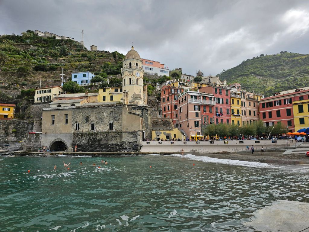 Nach einigen Kurven auf der engen Küstenstraße mit teilweise spektakulären Ausblicken aufs Meer war der erste Halt Vernazza. Am oberen Ende des Ortes gibt es einen Parkplatz – und dann kommt man durch eine Fußgängerzone mit überwiegend touristischen Geschäften und Ständen zum Meer. Ein Teil der Mole war wegen der hohen Wellen gesperrt, aber es war auch hinter der Absperrleine ein spektakulärer Anblick.