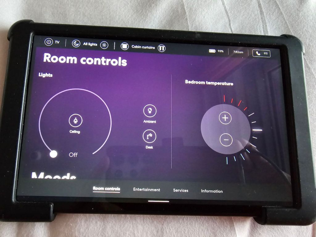 3. Das Lichtkonzept in der Kabine ist etwas gewöhnungsbedürftig und nicht ganz so praktisch. Wenn man abends geht, sollte man dran denken, zumindest das Licht am Bett anzulassen, zumal es abends keinen Turndown-Service gibt. Diese Lampe ist nur für Langarmige im Bett liegend zu löschen und etwas zu gedämpft, um damit gut im Bett zu lesen. Ersatzweise muss man das Tablett am Bett haben und alles entsprechend steuern – und daran denken, es tagsüber wieder in die Halterung zum Aufladen zu stellen.