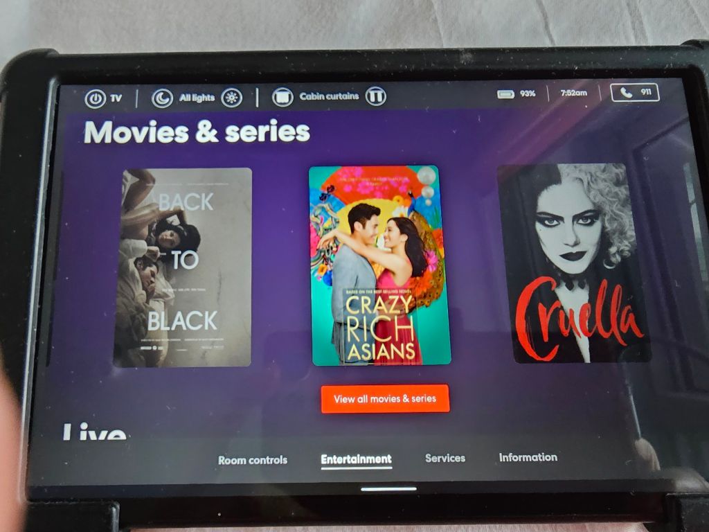 3. Da es im Mediaprogramm in der Kabine nur einige Fernsehsender und viele Filme on Demand gibt, aber keine Playlists oder Radioangebote, ist ein Bluetooth-Lautsprecher hilfreich, wenn man die eigene Playlist vom Smartphone nicht über Kopfhörer sondern in angemessener Lautstärke nicht nur über den Lautsprecher im Handy hören will.