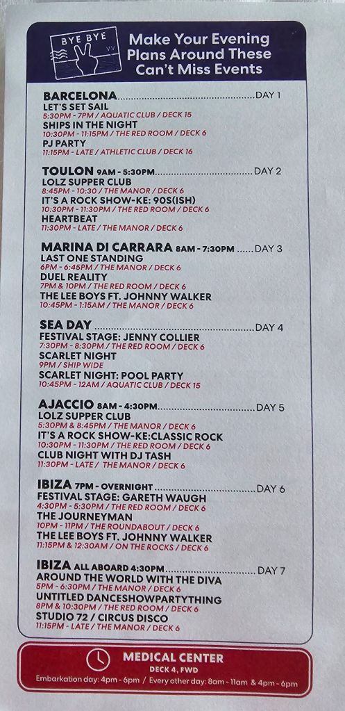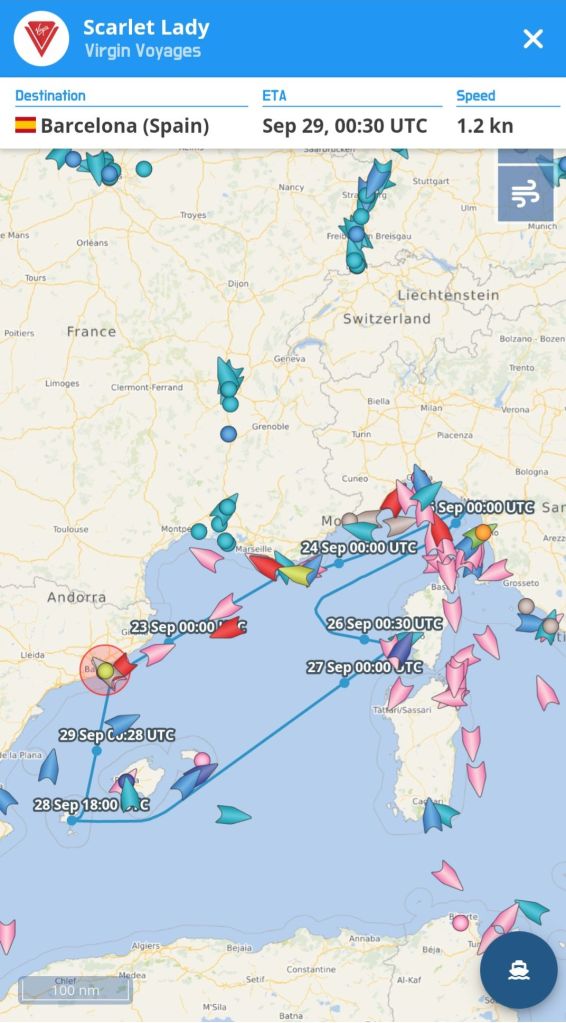 Deshalb habe ich – unterstützt durch den einen oder anderen Vlog – mal was ganz anderes als sonst ausprobiert: eine einwöchige Kreuzfahrt mit der Scarlet Lady von Virgin Voyages ab/bis Barcelona durch das westliche Mittelmeer.