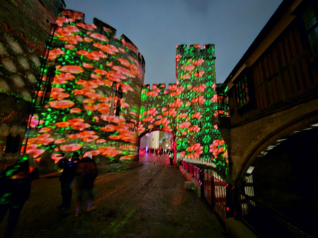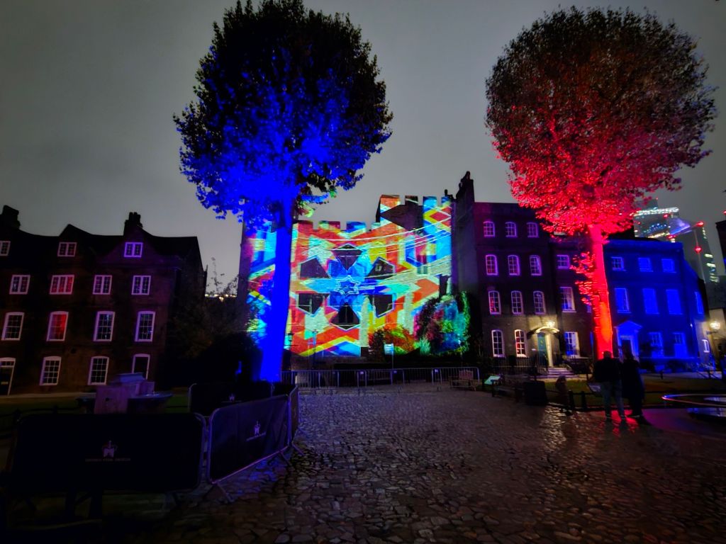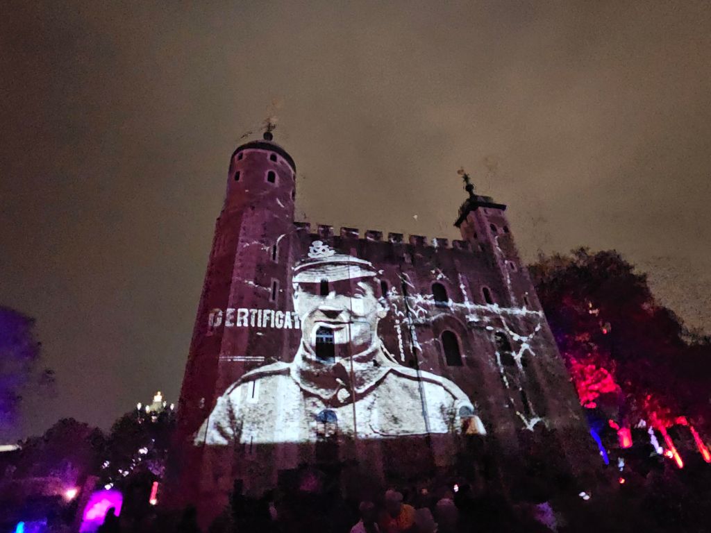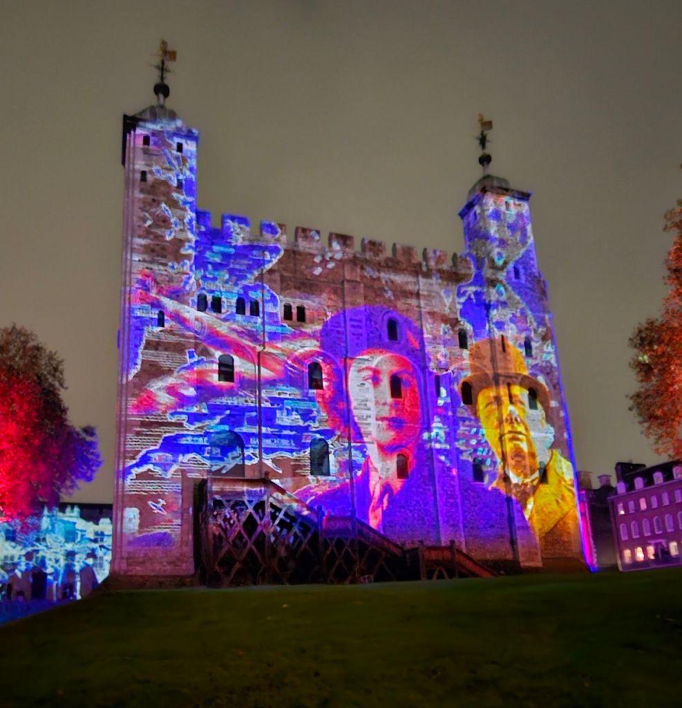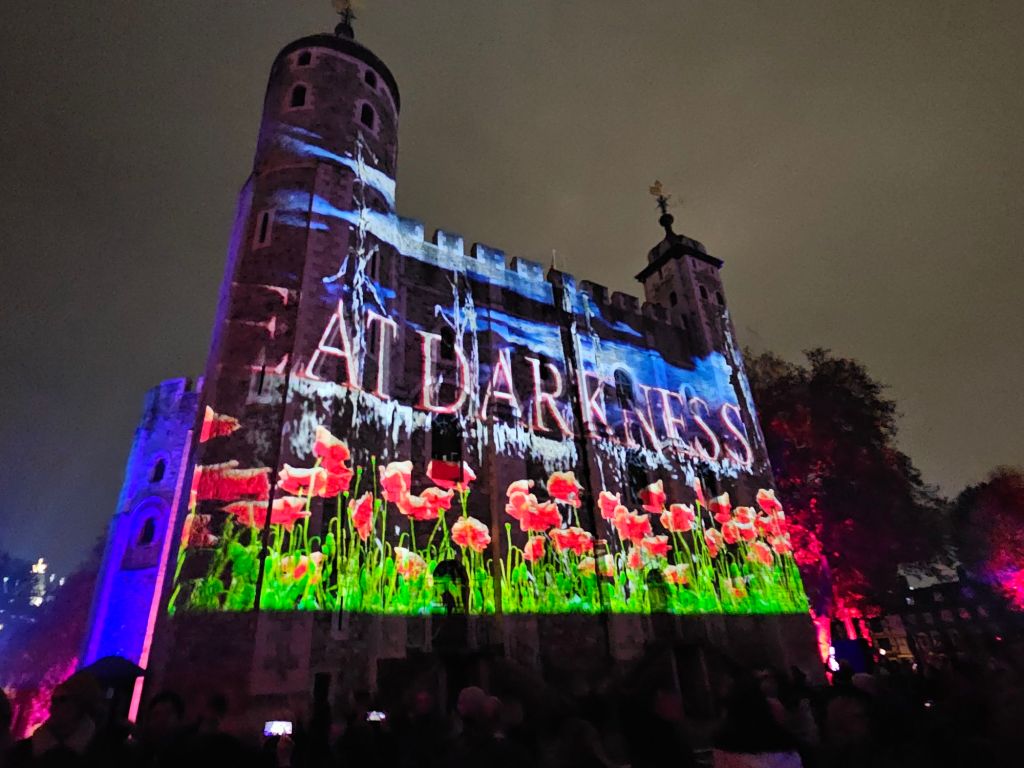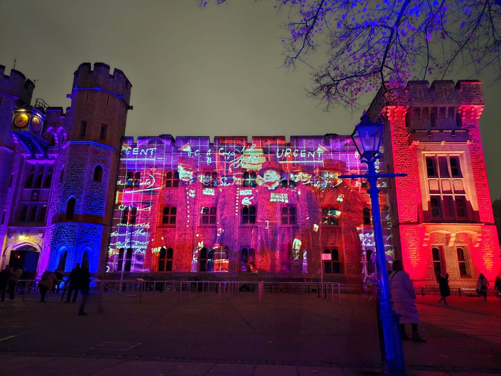 Schon am Freitag Abend erhielt ich eine Mail, die mich an den Besuch erinnerte – und ein paar Hinweise zur Veranstaltung gab. Bei meiner Ankunft am Tower kurz vor meinem gebuchten Timeslot war ich wieder sehr fasziniert vom englischen Warteschlangen-Management – mit viel menschlicher Arbeitskraft und sehr entspannt. Erstmal drin war an einem nebligem Novemberabend eine sehr beeindruckende Ton-Bild-Installation im gesamten Außenbereich des Tower zu erleben – und ein Blick auf die Kronjuwelen war auch noch möglich.