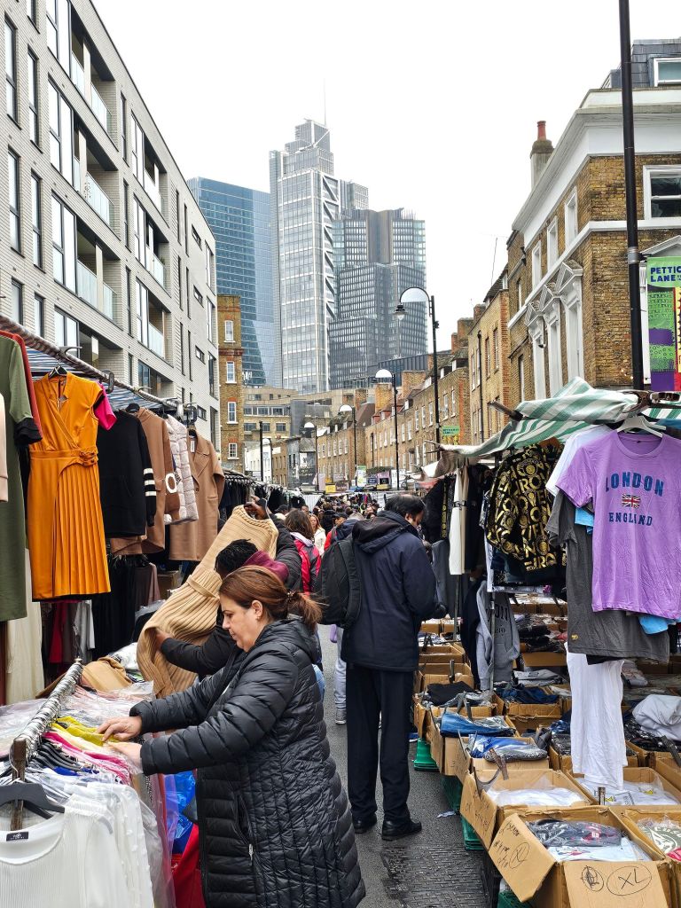 Der Spitalfields Market ist überdacht, verbindet Streetfood mit vielen Marktständen und wird nicht nur von Touristen besucht. Und auf dem Weg zu diesem Markt bin ich am Petticoat-Lane-Market vorbei gekommen – wo man sich fragt, wie wenig die Näherinnen für diese Kleidungsstücke bekommen haben, die hier für 5 oder 10 £ an den Ständen angeboten werden.