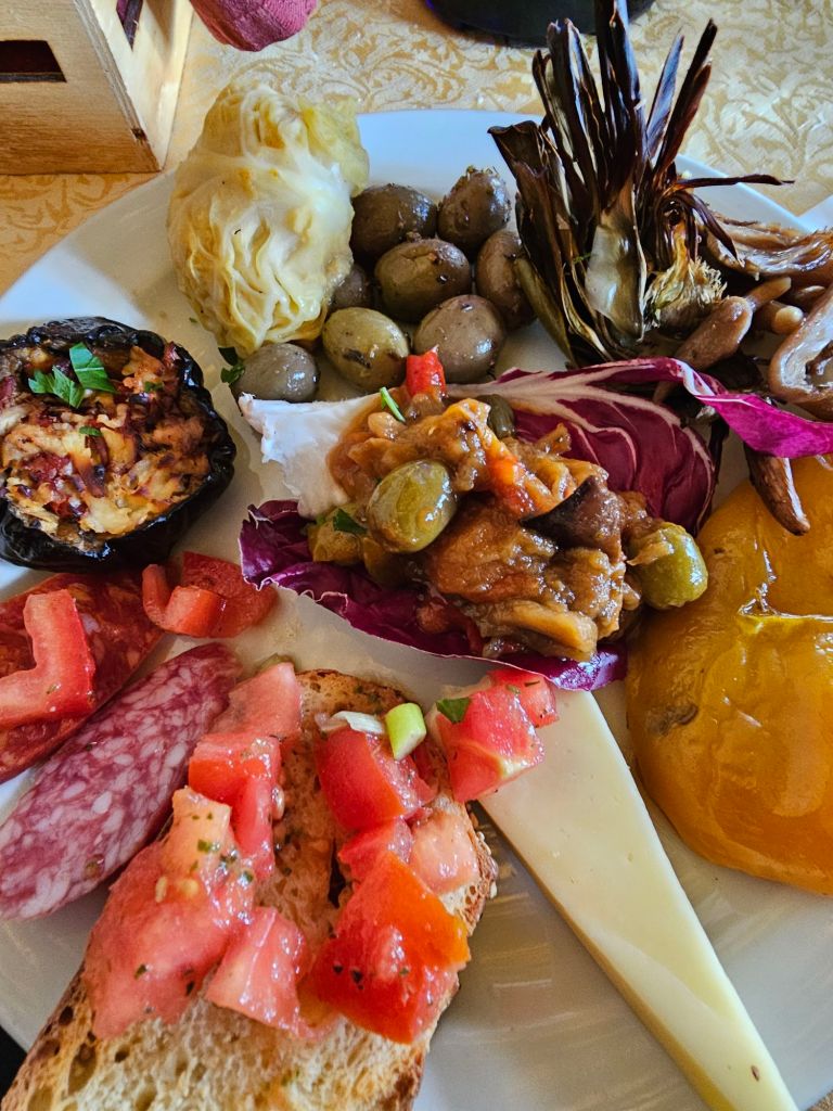 Zum Abschluss des Tages gab es ein Mittagessen in einer Trattoria am Rande von Nirgendwo, wo uns auf dem Weg vom Bus dorthin eine Ziegenherde begegnete und wir sehr feine Antipasti genießen konnten. Hier habe ich etwas Neues auf die Liste meiner geschätzten Vorspeisen mit einem sonst von mir weniger geschätzten Gemüse, Auberginen, aufnehmen können, die Carponata https://de.wikipedia.org/wiki/Caponata.