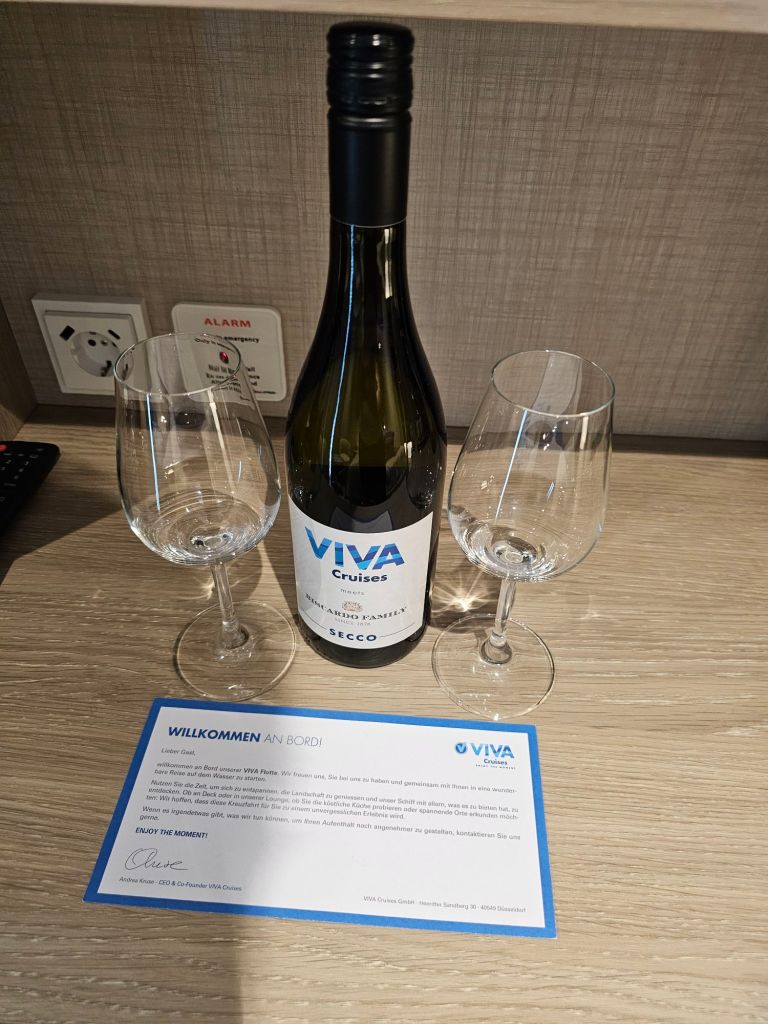 2. Es ist sehr nett, dass man bei Ankunft auf der Kabine besonders begrüßt wird. Leider ohne Alternative mit einer Flasche Prosecco. Das ist bei VIVA besonders schade, denn die Barkarte hat auch gute alkoholfreie Alternativen, neben dem Cocktail immer auch einen Mocktail des Tages und sogar alkoholfreien Wein im Angebot.