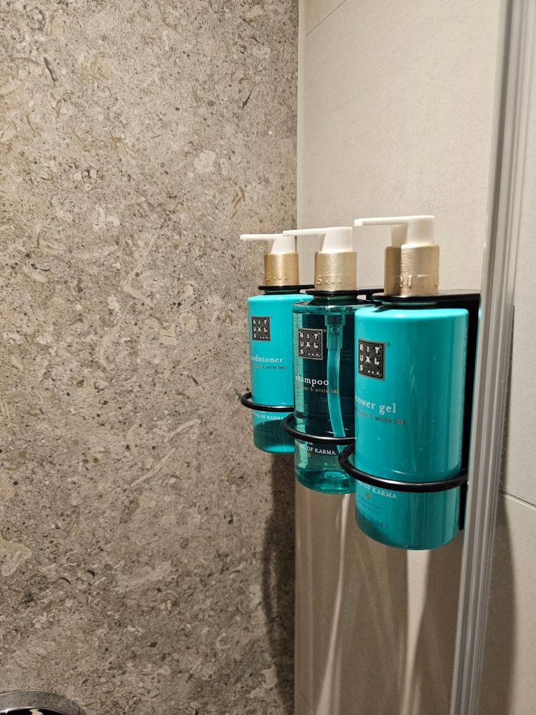 Was ich neben dem klaren Design der Kabinen mag, ist die Ausstattung mit Rituals-Produkten im Badezimmer – das ist sehr angenehm – Duschgel, Shampoo und Conditioner in der Dusche (Handdusche und Regenschauerdusche mit hansgrohe-Armaturen), Seife und Lotion am Handwaschbecken.