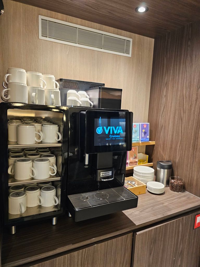 Im VIVA-Konzept ist nicht nur eine kleine Minibar mit Softdrinks und Bier enthalten, ein Wasserkocher und auf der Enjoy auch eine Nespresso-Maschine auf der Kabine, sondern auch jederzeit zugängliche Wasserspender (mit und ohne Sprudel) für die in der Kabine Wasserflaschen bereit stehen und grosse Kaffeemaschinen, die auch einen ordentlichen Cappuccino produzieren.