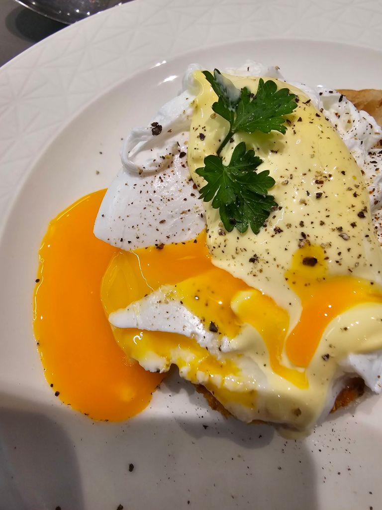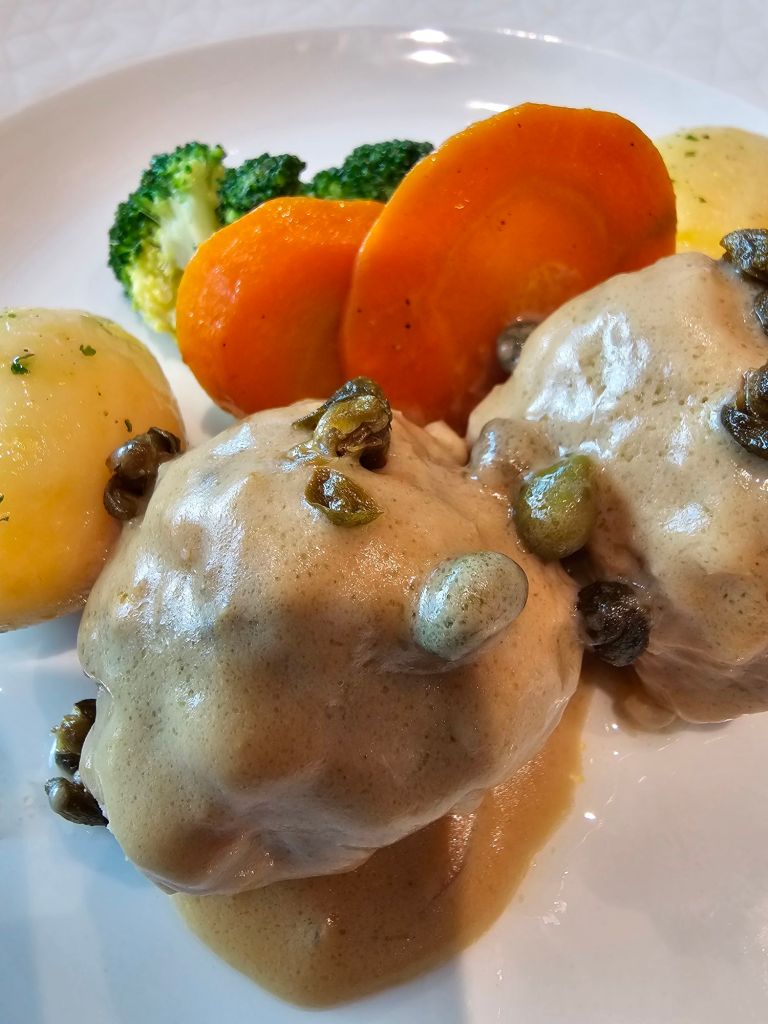 Die Küche hat ganz überwiegend eine sehr gute Leistung abgeliefert. Sieben von acht pochierten Eiern hatten ein flüssiges Eigelb (diese Quote hat die Cunard-Küche meiner letzten Reisen nie geschafft) und ein einziges Mal war ich mit dem Hauptgang nicht so richtig zufrieden – wenn man es Fleischbällchen mit Soße genannt hätte, wäre es gut gewesen. Aber es firmierte als „Königsberger Klopse“. Die haben für mich eine weiße statt einer braunen Soße und werden mit roter Beete anstatt Gemüse gereicht.