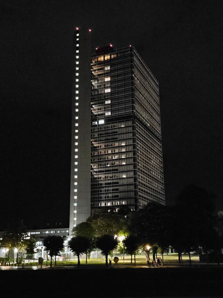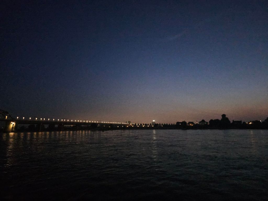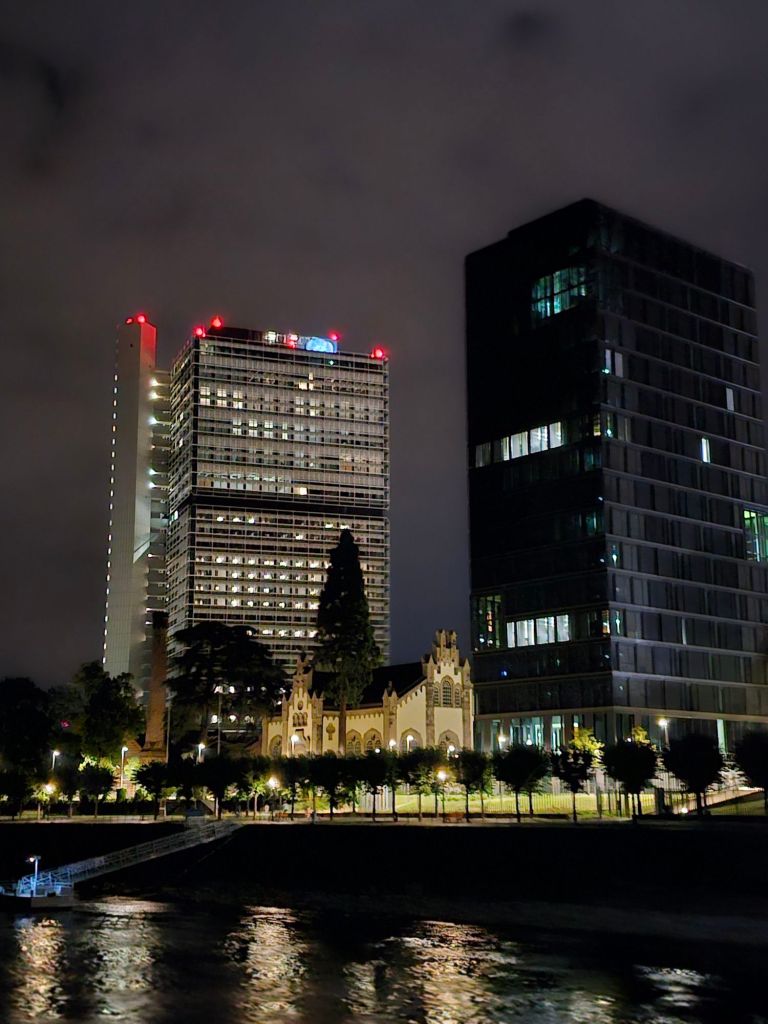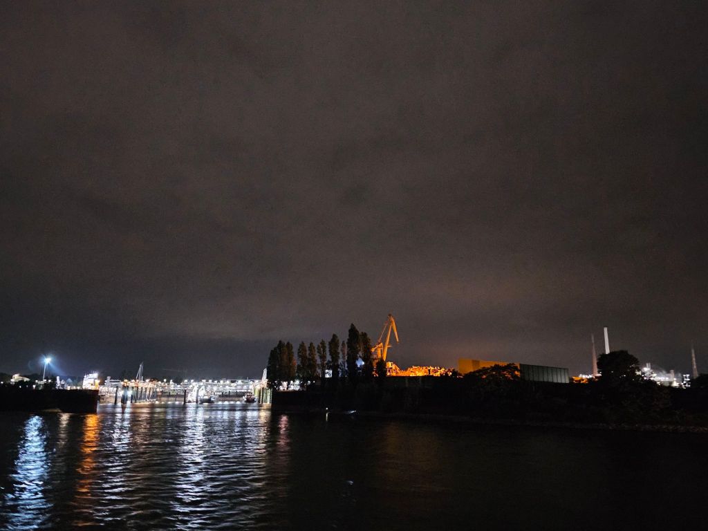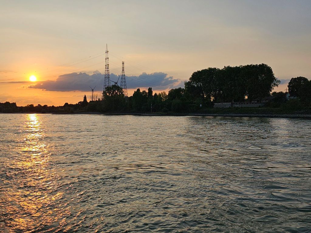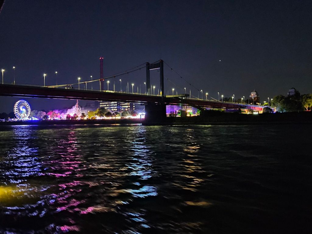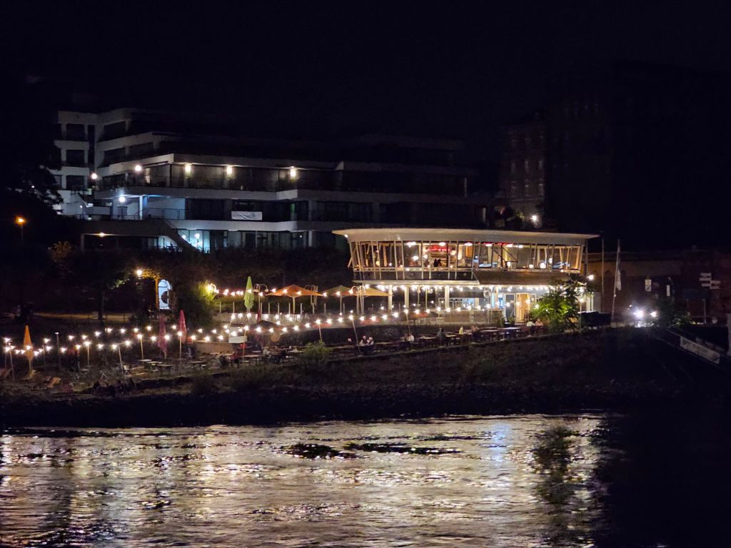 Sonnabend bis in die Nacht auf dem Rhein zwischen Köln und Bonn auf dem Oberdeck. Es ist warm genug, draußen zu sitzen. Es geht an hell erleuchteten großen Industrieanlagen vorbei und Wohnhäusern, in denen bestenfalls ein Fernseher das Licht in den Fenstern zeigt. Es geht von Stille mit Vogelzwitschern bis zu lauter Partymusik an Land und auf Partyschiffen.