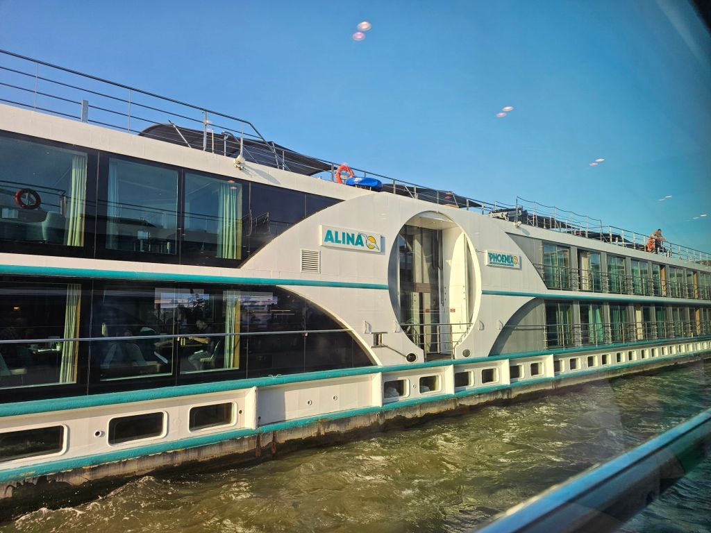 Das Schiff musste noch etwas warten, weil es einem bauähnlichen Schiff, der Alina von Phoenix Reisen, noch den Platz direkt am Kai lassen musste – das „Einparken“ war dann während des Frühstücks gut zu verfolgen.