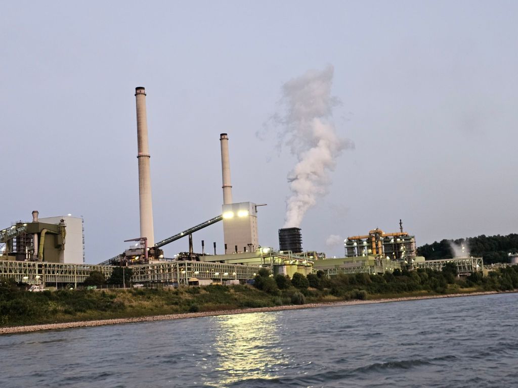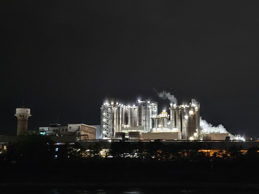 Vom Wassser und im Dunkeln zeigt sich die Größe von Industrieanlagen am Rheinufer zwischen Köln und Bonn, die man zwar auch vom Zug aus sieht, aber so im wahrsten Sinne von der anderen Seite und in anderem Licht.