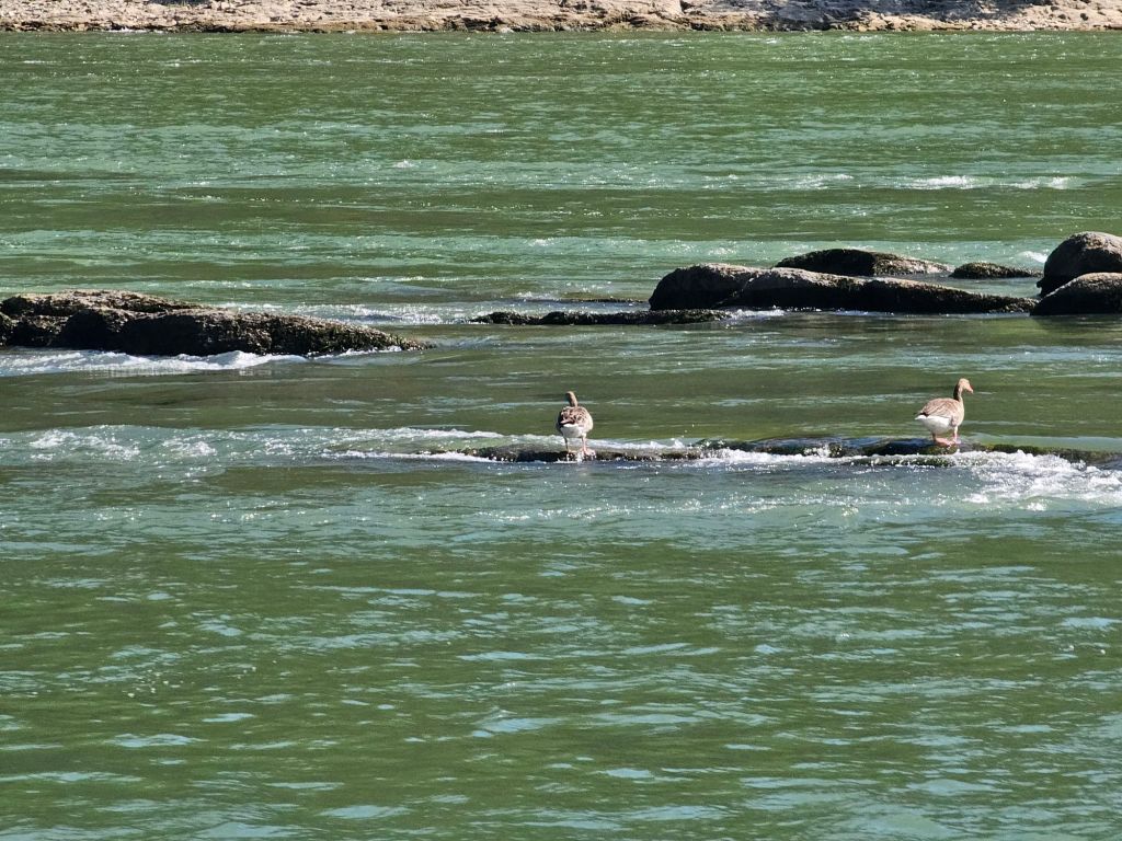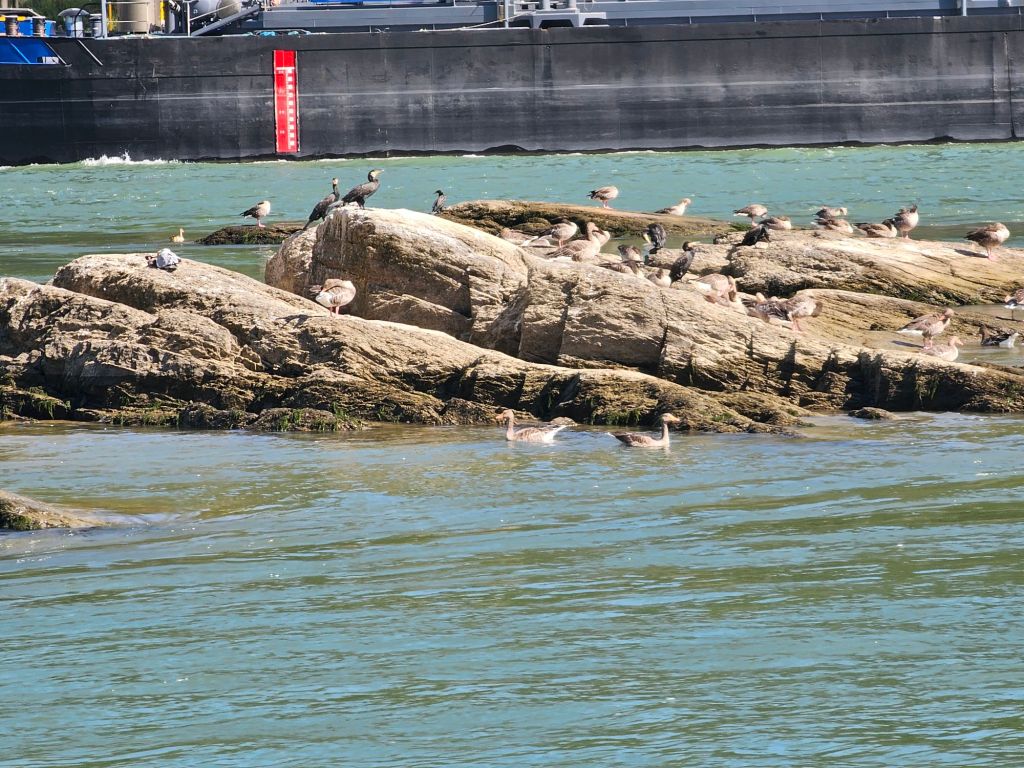 Die folgende Fahrt auf dem Rhein war angenehm trotz hoher Temperaturen an Land, die Mensch und Tier zu Abkühlung im Wasser angeregt hat.