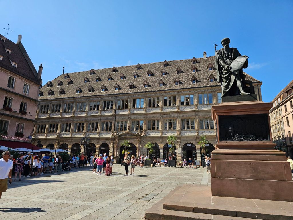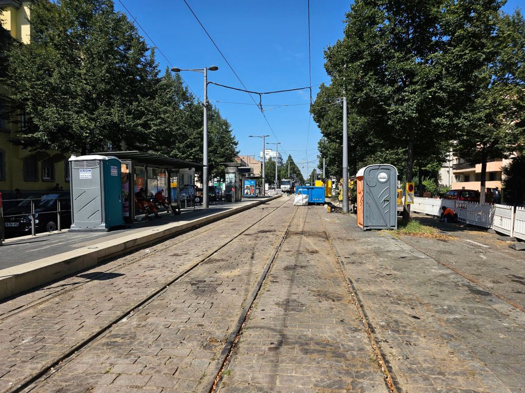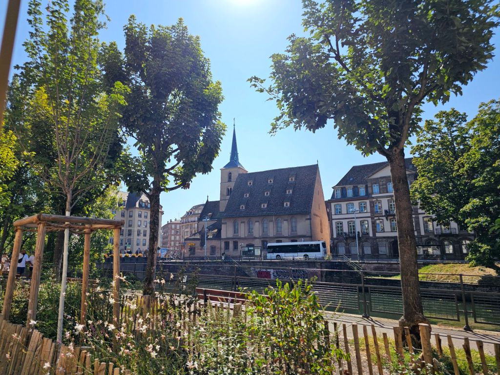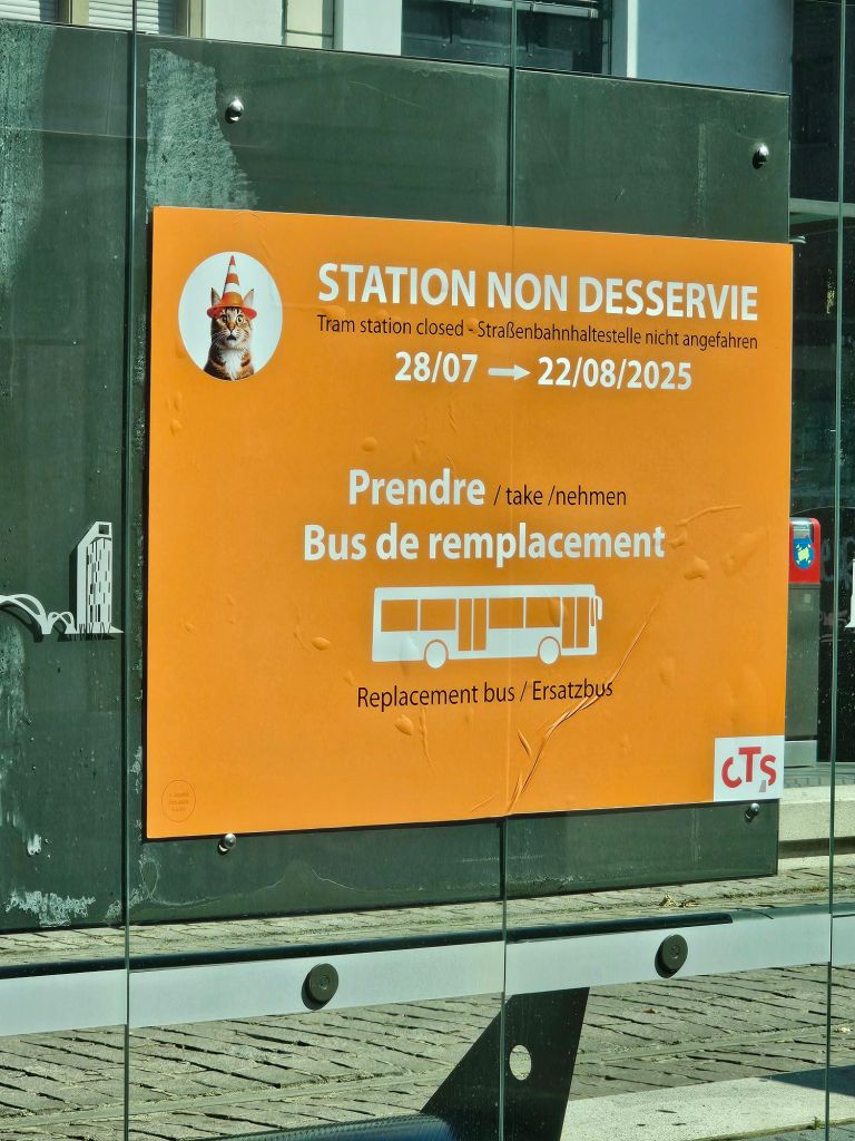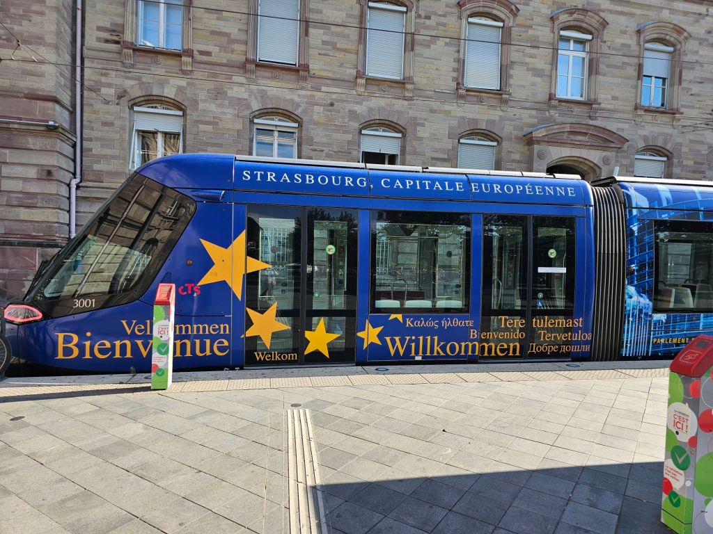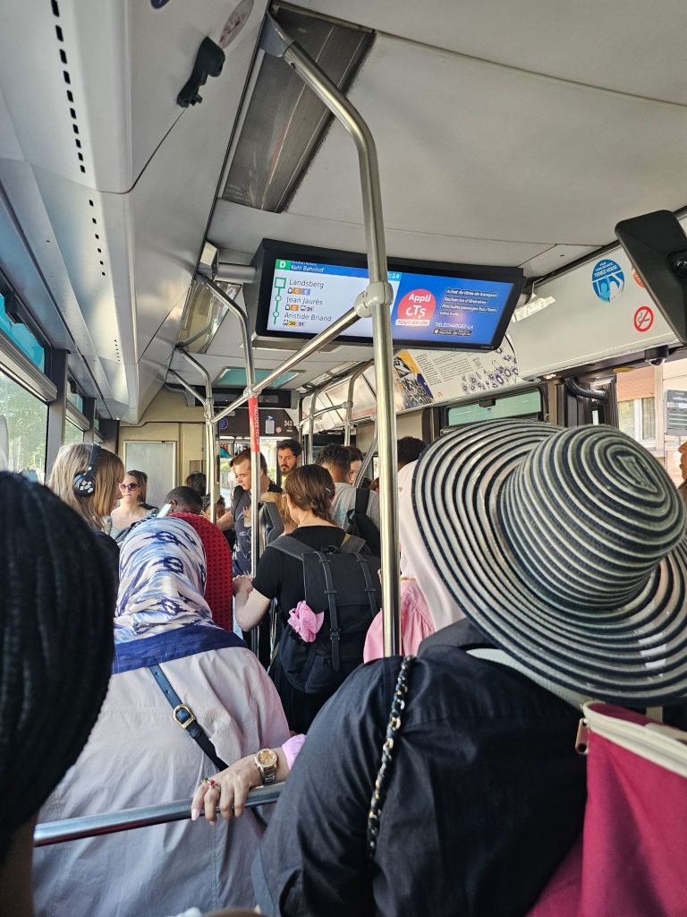 Eigentlich ist das mit dem ÖPNV in Kehl und Straßburg einfach. Man könnte – wenn man die 25 Minuten Fußweg vom Liegeplatz des Schiffes durch ein Industriegebiet mit schmalen Gehwegen ohne Schatten geschafft hat – mit der Tram vom Bahnhof Kehl bis zum Straßburger Münster fahren. Dann muss man nur noch herrausfinden, wie das mit dem Ticket ist: Das Deutschlandticket würde zwar für den Zug von Kehl nach Straßburg gelten, aber für den ÖPNV gilt das Deutschlandticket nicht und man muss wieder rausfinden, welche Nahverkehrsapp die richtige ist und alle Anmeldeschritte erfolgreich bewältigen.