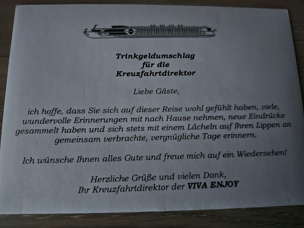 Und auch wenn das Schiff und seine Crew international sind – Deutsch ist auch Bordsprache. Abgesehen davon, dass ich das Trinkgeld nicht dem Kreuzfahrtdirektor, sondern der gesamten Crew gebe, wäre richtige Grammatik bei gedruckten Dingen wichtig. Protipp; Wenn man das Wort „Kreuzfahrtdirektor“ durch „Crew“ ersetzt, ist es grammatikalisch richtig.