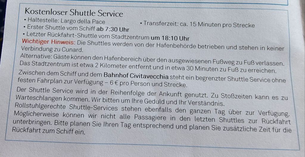 2. Es ist schön, dass ich bei der Ankunft auf dem Schiff – das ich mit dem Shuttlebus, der nicht weiter ausgeschildert war, erreicht habe – im Tagesprogramm die Informationen über den Shuttlebus finde, die ich mir vor Anreise per Mail gewünscht hätte. Cunard hat mir gefühlt jeden zweiten Tag eine Mail geschrieben, um mich an Sachen zu erinnern, die ich schon erledigt hatte oder weil sie mir etwas verkaufen wollten. Warum schaffen sie es dann nicht, eine Mail an alle, die keine Anreise über sie in Rom gebucht haben, mit diesen Informationen zum Shuttlebus zu verschicken? Oder meinen sie, die Informationen interessieren nur die, die ohne einen organisierten Ausflug auf eigene Faust mit dem Zug nach Rom fahren?