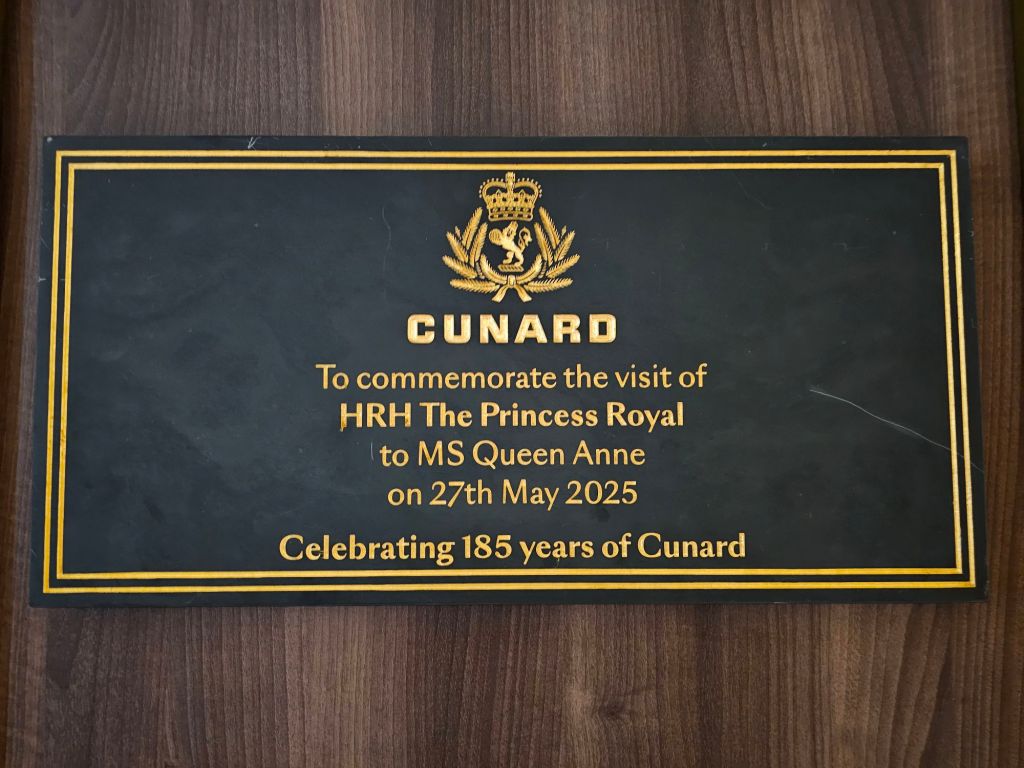Beim neuen Schiff, der Queen Anne, hat man stattdessen die Stadt Liverpool zur Taufpatin gemacht. Es gab aber 2025 königlichen Besuch in Liverpool auf dem Schiff – daran erinnert jetzt eine Plakette an prominenter Stelle auf Deck 2.