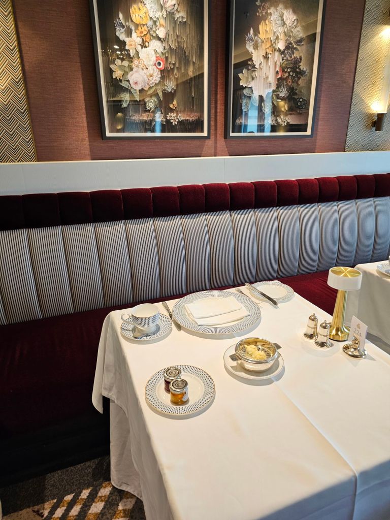 Nachdem ich im Juni den Britannia-Club auf der Queen Victoria erlebt habe, der gut war, habe ich auf der Queen Anne erlebt, dass hier – auch aufgrund der beim Bau des Schiffes mitgedachten räumlichen Elemente – das Konzept  wirklich sein Geld wert ist, wenn man guten Service mag. Der Service im Britannia-Restaurant ist gut, aber es ist lauter und das Personal muss mehr Tische bedienen. Im Britannia-Club ist es ruhiger, dadurch, dass man immer denselben Tisch hat, sind selten alle Tische gleichzeitig besetzt und der Service kann sich sehr schnell auf jeden Gast besser und persönlicher einstellen. So war schon am zweiten Tag an meinem Tisch nur ein Gedeck aufgelegt, was sonst beim Dinner im Britannia-Restaurant schon ein paar Tage dauern kann und es war schnell klar, dass ich Tee anstelle von Kaffee trinke.