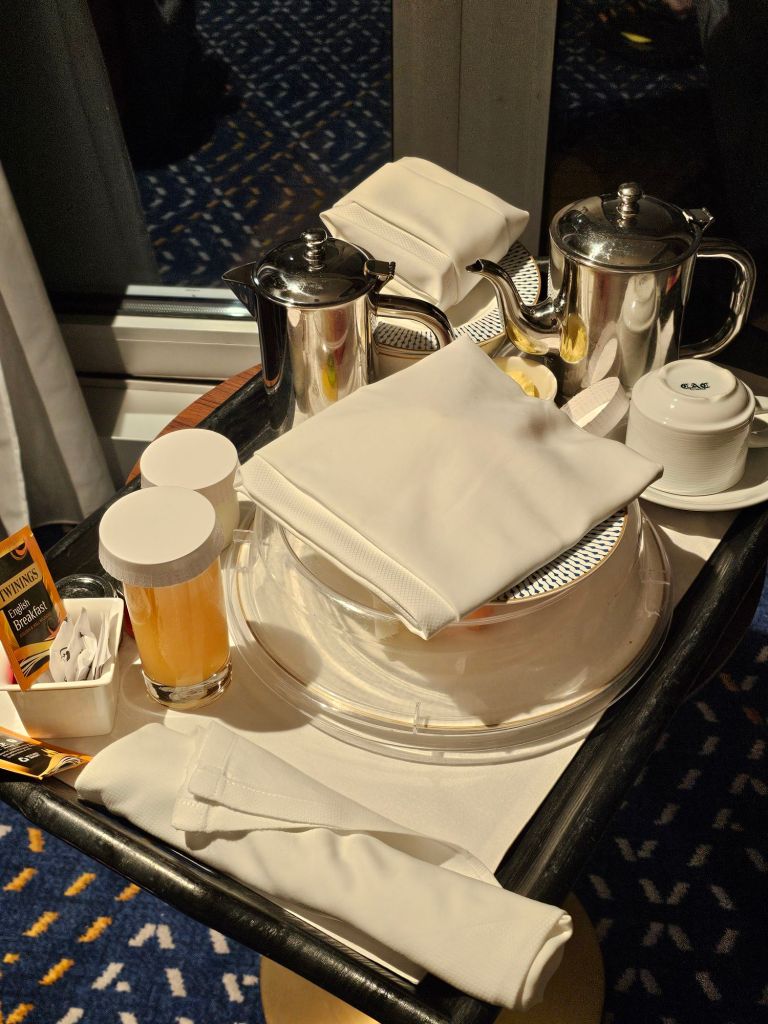 Da der Tag früher als sonst startete, habe ich mir das Frühstück auf die Kabine bestellt.