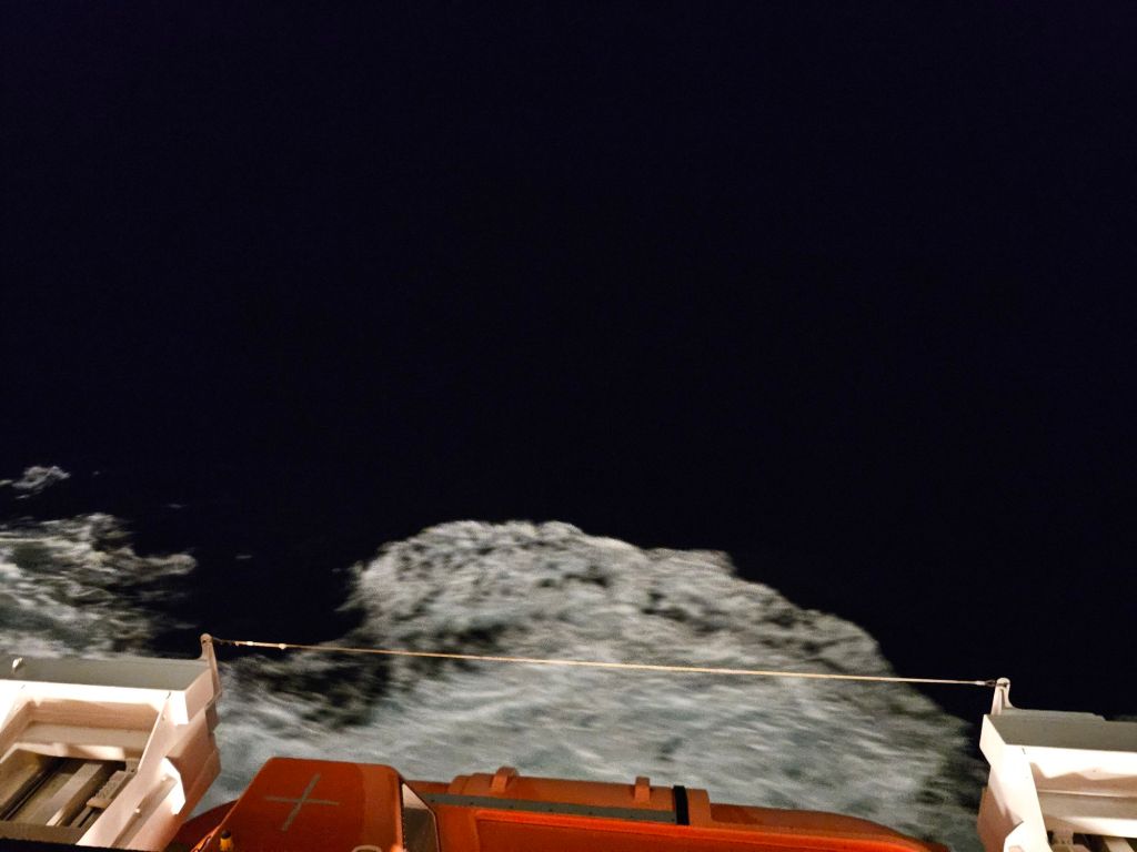 Der Golf von Biskaya kann auch Ende August ziemlich stürmisch sein, was man selbst mittschiffs mit einigen Bewegungen auf dem Schiff und dem Klappern der Bügel im Schrank merkt.