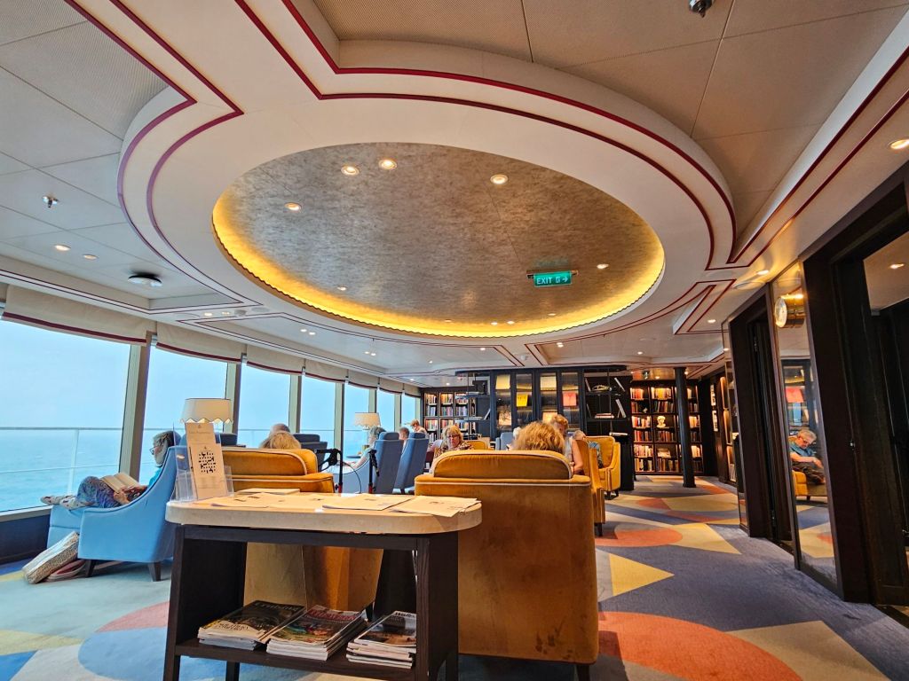 5. Die Bibliothek auf der Queen Anne ist kleiner als auf den anderen drei Schiffen von Cunard. Man kann dort aber nett sitzen und in Ruhe  lesen, auch wenn die schönen Sessel mit Blick aufs Meer schnell besetzt sind.