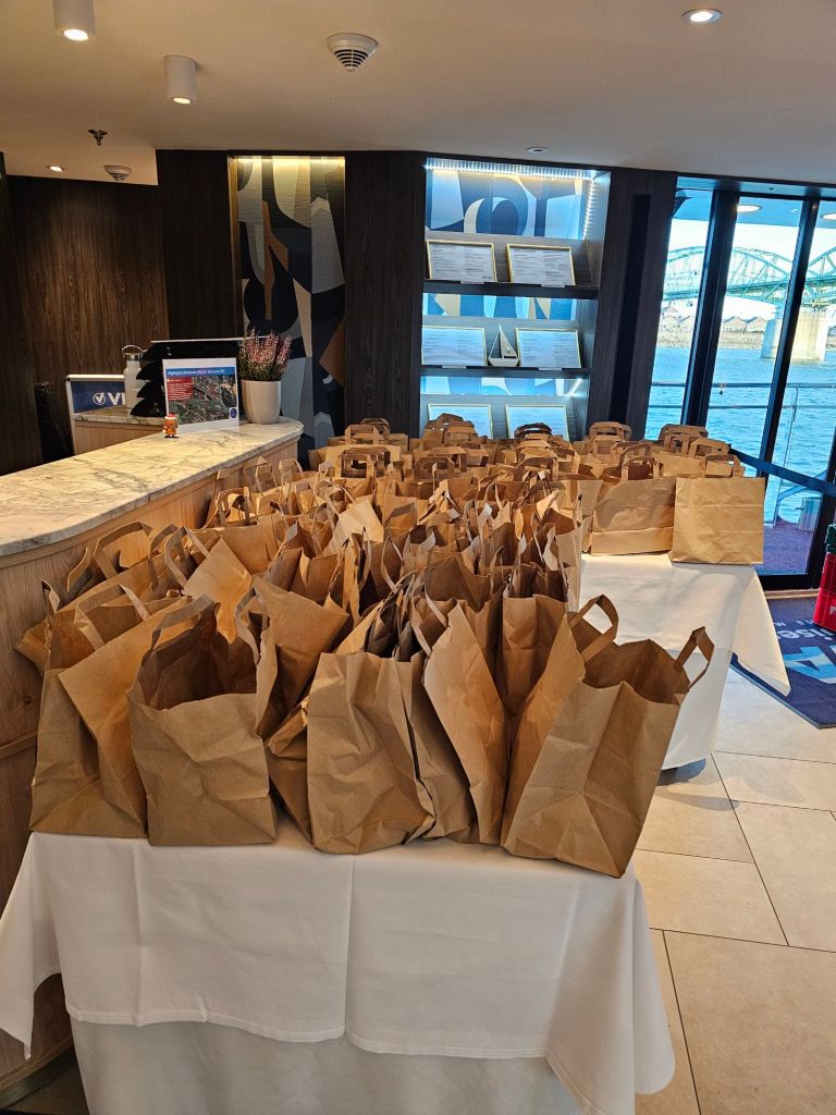 Mittlerweile wurde das Alternativprogramm kommuniziert: wir legen in Komarom an. Gebuchte Ausflüge für Budapest und Esztergom (dort sollten wir Silvestervormittag liegen) werden rückerstattet. Alle bekommen das Angebot, kostenfrei mit einem Bus ab Schiff einen Tagesausflug nach Budapest oder einen etwas kürzeren Ausflug nach Esztergom zu machen. Und dafür bekam man sogar noch ein Lunchpaket mit auf den Weg.