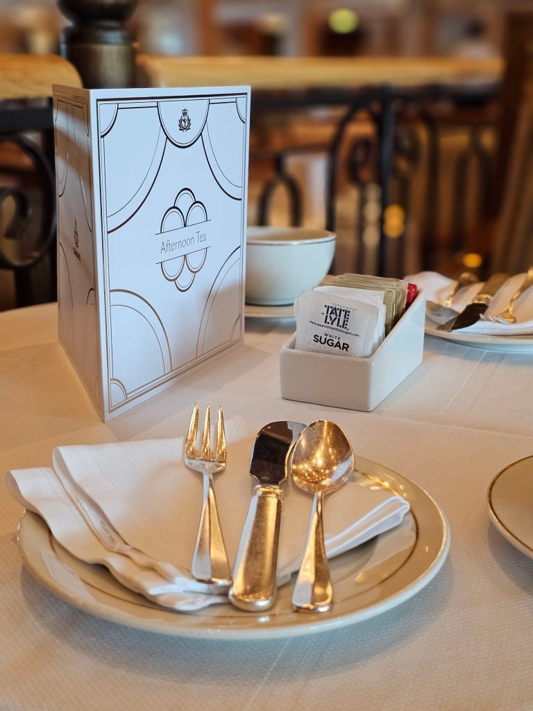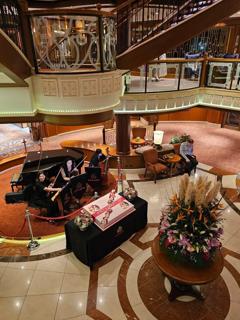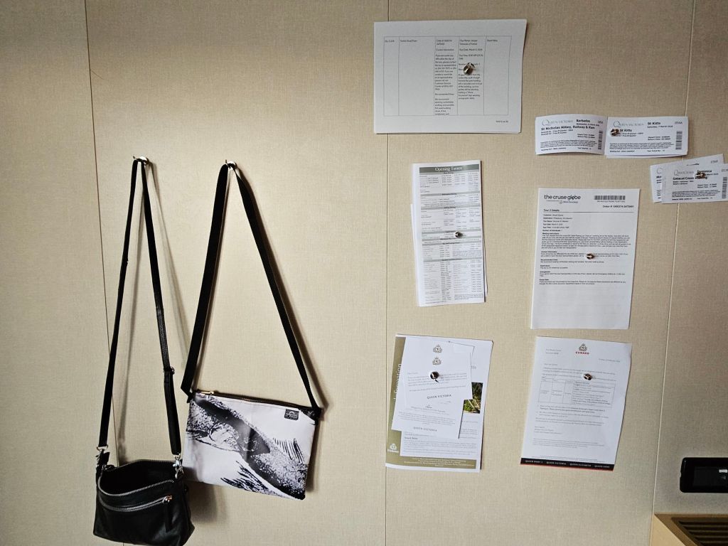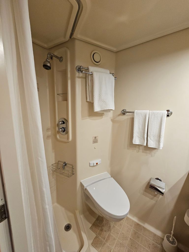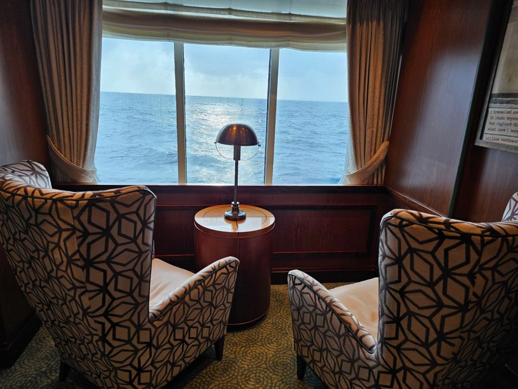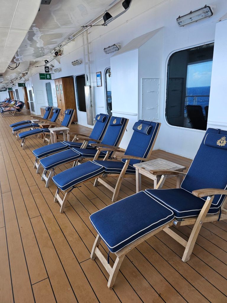 Im Bad gibt es nur eine kleine Dusche, die fest installiert ist, mit einem Duschvorhang. Zumindest bei den kleinen Annehmlichkeiten vermisse ich den Kabinenstandard der Queen Anne: viele Steckdosen samt USB-Anschlüssen, ein Nachtlicht und eine etwas grössere Dusche mit Glaswand, auch wenn hier das mit der Tür etwas tricky sein kann. Ansonsten ist die Queen Victoria noch „echtes“ Cunardfeeling, angefangen bei der schönen Artdeco-Gestaltung insgesamt über eine klassische entspannte Teatime bis hin zu echtem White Star Service überall auf dem Schiff. Und zum Willkommen gab es auch eine sehr nützliche vierseitige Information für die gesamte Reise incl. Hinweisen zu den erforderlichen Dokumenten in jedem der angelaufenen Häfen und eine persönliche Information über die Vorteile meines Loyalty-Status im World Club. Da es dieses Mal zwei Rechnungsperioden gab, hatte ich zweimal das Internetguthaben – und damit letztlich zwei Tage mehr kostenfreies Internet als gedacht. Da ich bei dieser Reise keine eSIM oder die Angebote meines Handyanbieters ausserhalb der EU genutzt habe, war mein Handy ausser auf Madeira und Teneriffa ab der Abfahrt aus Southampton – Hoch lebe das kostenfreie EU-Rooming ! – im Flugmodus und ich bin auch mit dem daraus folgenden eingeschränkten Internetzugang gut zurecht gekommen.