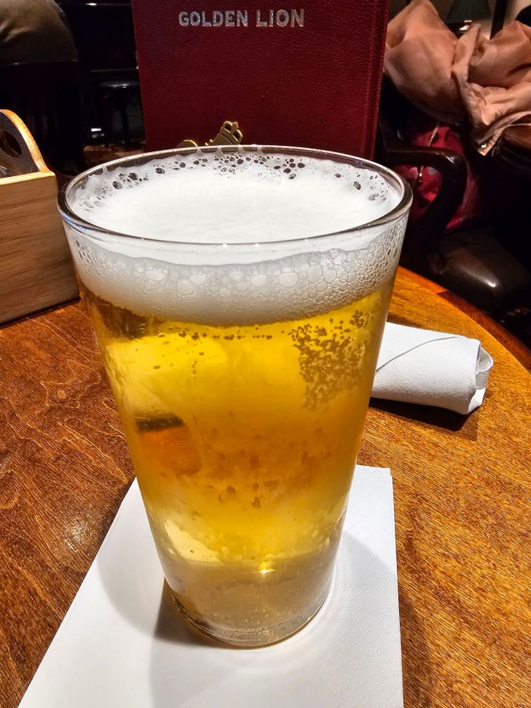 In England nieselte es auch und wir waren schließlich um 11.45 Uhr in Southampton, dieses Mal am Ocean Terminal. Das Einchecken ging wie immer bei Cunard schnell und angenehm. Um 12.00 Uhr habe ich mein Handgepäck in der Kabine auf Deck 5 abgestellt, mich bei der Musterstation gemeldet und bin erstmal auf einen Publunch in den Golden Lion gegangen. Dort ist es am Einschiffungstag weniger hektisch als im Lido-Buffet-Restaurant, obwohl ich persönlich finde, dass das Speisenangebot im Pub vor der Überarbeitung der Karte durch Michel Roux deutlich besser war. Aber einen „Pie of the Day“ gibt es immer noch ohne Zuzahlung – und im Pub gönne mir dazu (das meist einzige) Bier: mein persönliches Startritual einer Cunard-Reise.