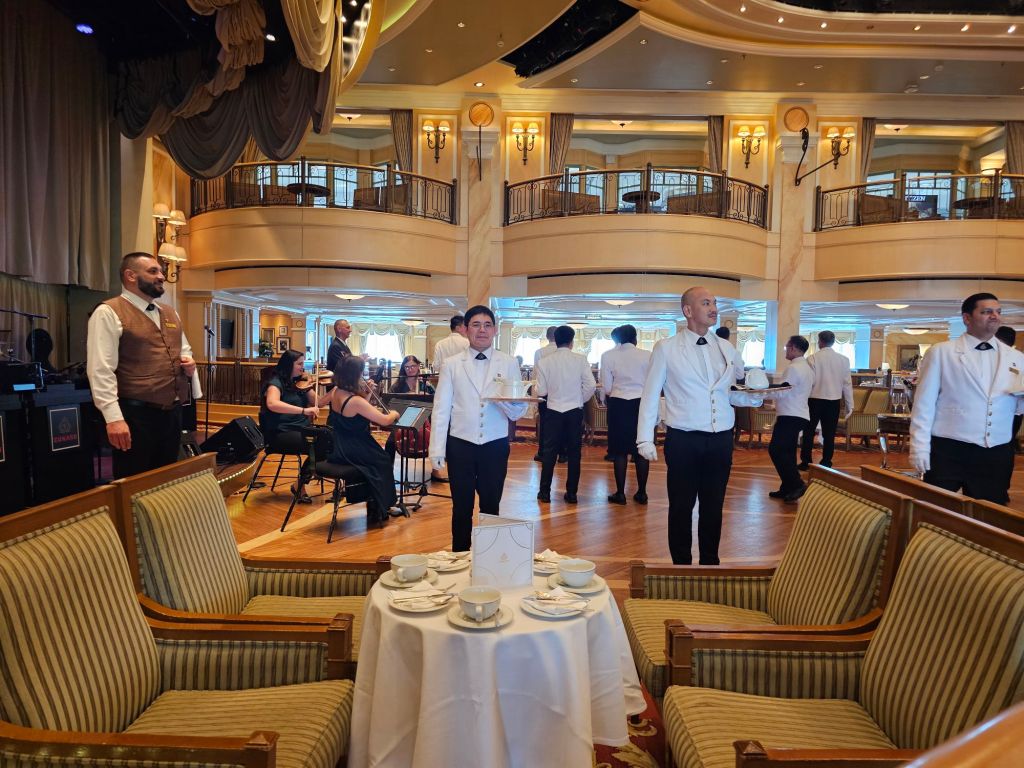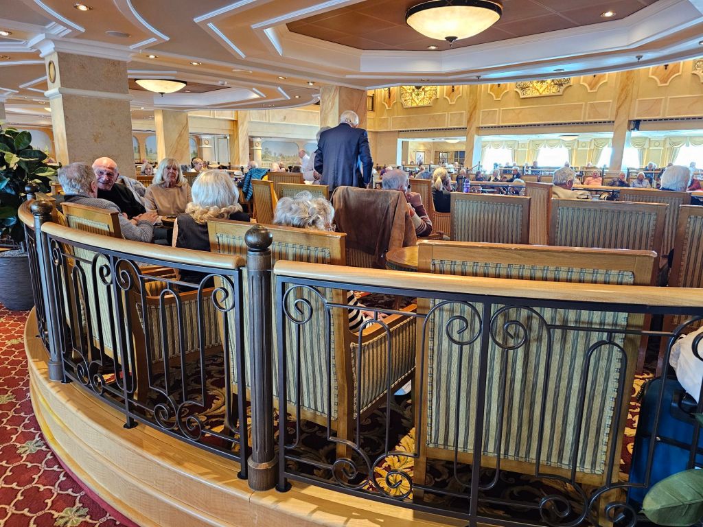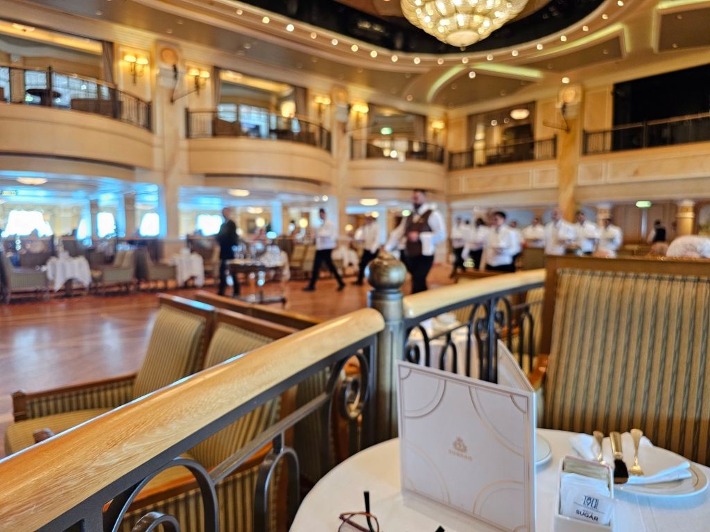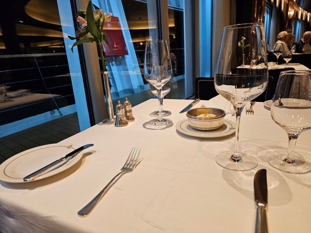 Zu den Dingen, die man am Anfang einer Reise klärt, gehört die Lage des Tisches im Hauptrestaurant Britannia. Ich bevorzuge einen festen Tisch – und dieses Mal hatte ich einen schönen Tisch am Heckfenster mit einem zauberhaften Kellner, Gilbert, den ich auch bei der Teatime, beim Frühstück oder Lunch immer wieder mal mit Freude getroffen habe.