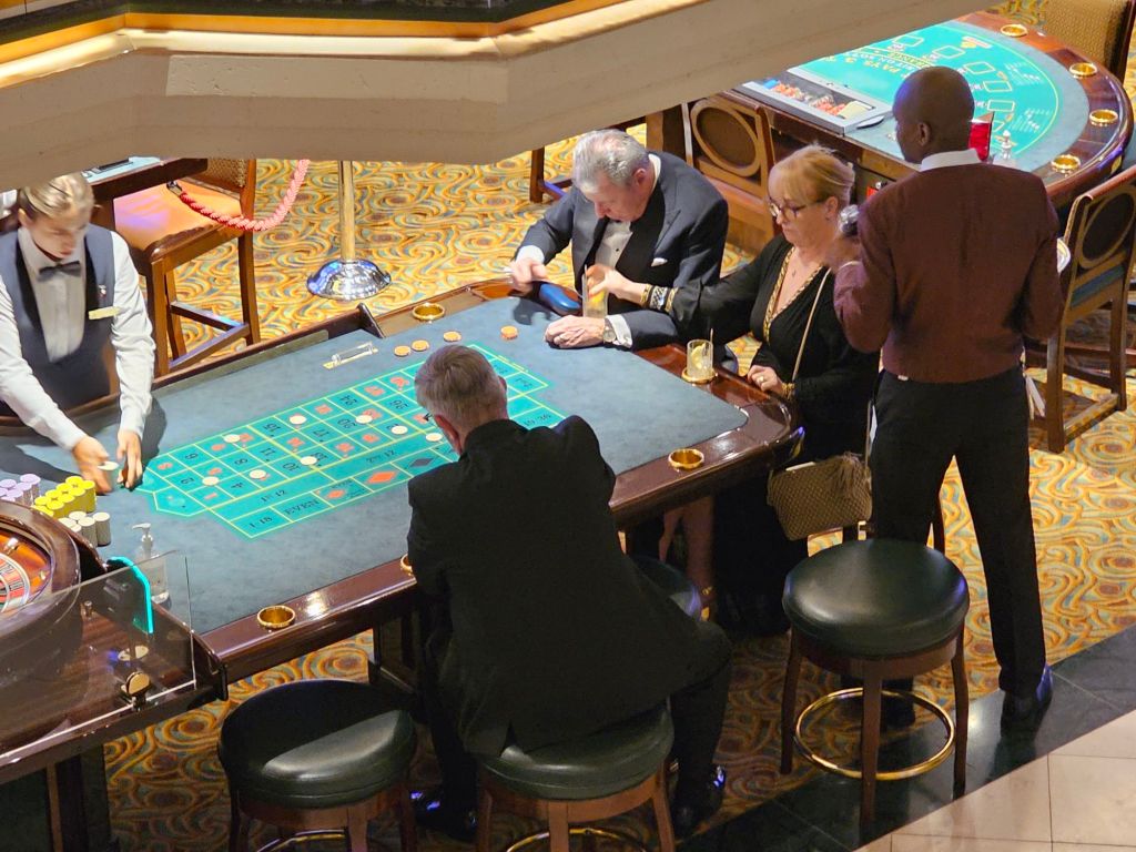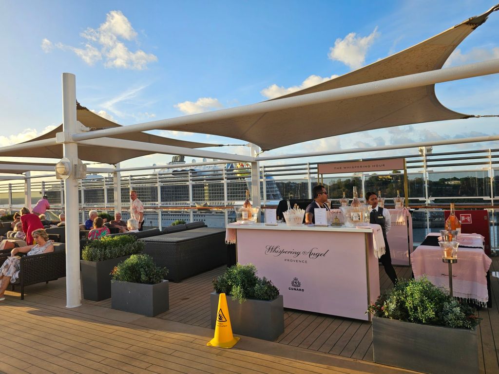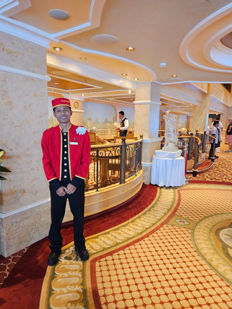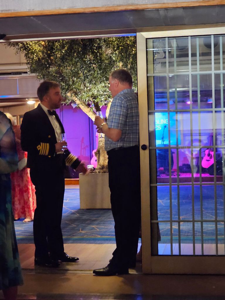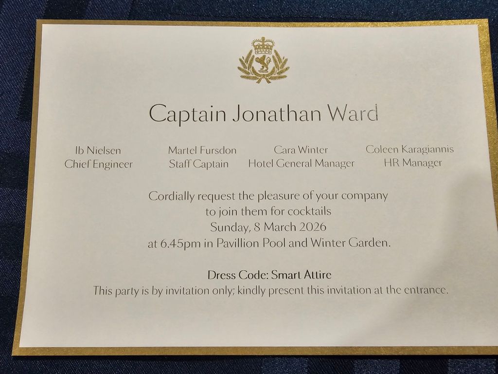 1. Der Service und die Crew auf dieser Reise waren wunderbar. Es war spürbar, dass auch jenseits der Grills alle Gäste überall Whitestar-Service bekommen. Sei es im Britannia-Restaurant, das eine sehr ruhige Umgebung war – ausser man hatte das Pech zufällig in der Nähe eines der wenigen extrem laut sprechenden Briten zu sitzen, über die Bars bis zu den Offizier*innen. Sei es, wenn ich im Purser Office mehrfach meine nicht funktionierende Tür reklamieren musste oder die besonderen Gesten der leitenden Offiziere des Hotelbereichs, die die Gäste in der Karibik morgens freundlich in den Landgang verabschiedeten und nachmittgs bei der Rückkehr persönlich mit einem heissen Tuch und einem Glas Wasser wieder begrüssten. Heiko Lorenz (Hotel Operations & Retail Manager) hat sich schon bei unserer zweiten Begegnung an mich erinnert und wir haben dann immer ein paar Worte auf Deutsch gewechselt. Beide Kapitäne – in Barbados hat Jonathan Ward das Kommando an Martyn Sharples übergeben – haben neben ihren Mittagsdurchsagen mit allgemeinen Infos zu Wetter und Strecke in den beiden besonderen Situationen mit medizinischen Notfällen schnell und transparent kommuniziert.