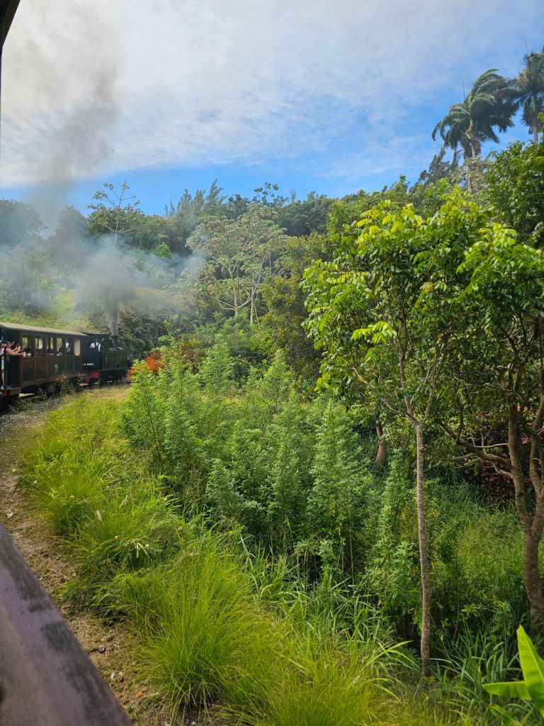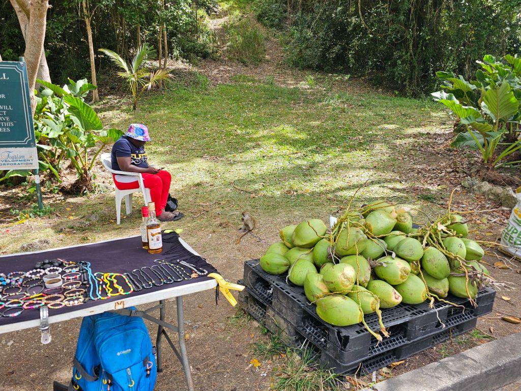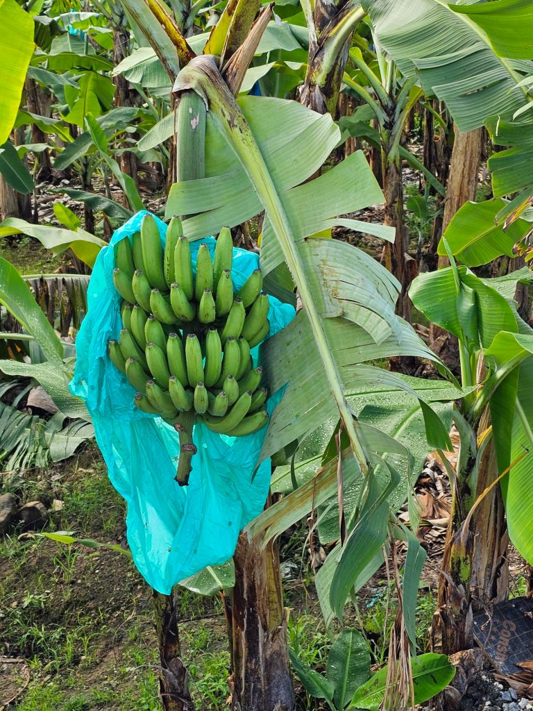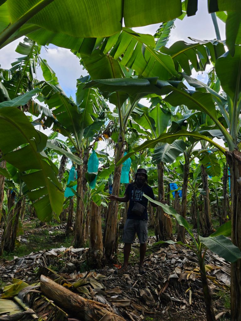 Nachdem mein Ausflug von Jungle Tours mich (etwas später als zur angegebenen Zeit) ausserhalb des Terminals eingesammelt hat, machten wir uns mit zwei Fahrzeugen auf den Weg. Ich hatte den Beifahrersitz im kleineren der beiden Fahrzeuge und zusammen mit einer Familie aus New Jersey, die wie anderen Teilnehmenden mit der Odyssey of the Sea unterwegs waren, kämpften wir uns erstmal durch die morgentliche Rush Hour. Erster Stop war eine genossenschaftlich betriebene Bananenplantage. Bananen – zum Essen wie zum Kochen – sind eines der Hauptprodukte der Insel. Wir haben eine Banane frisch vom Baum probiert und einiges über den Anbau erfahren.
