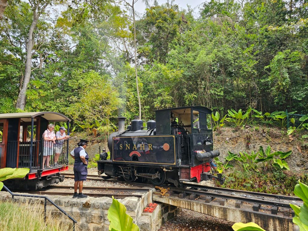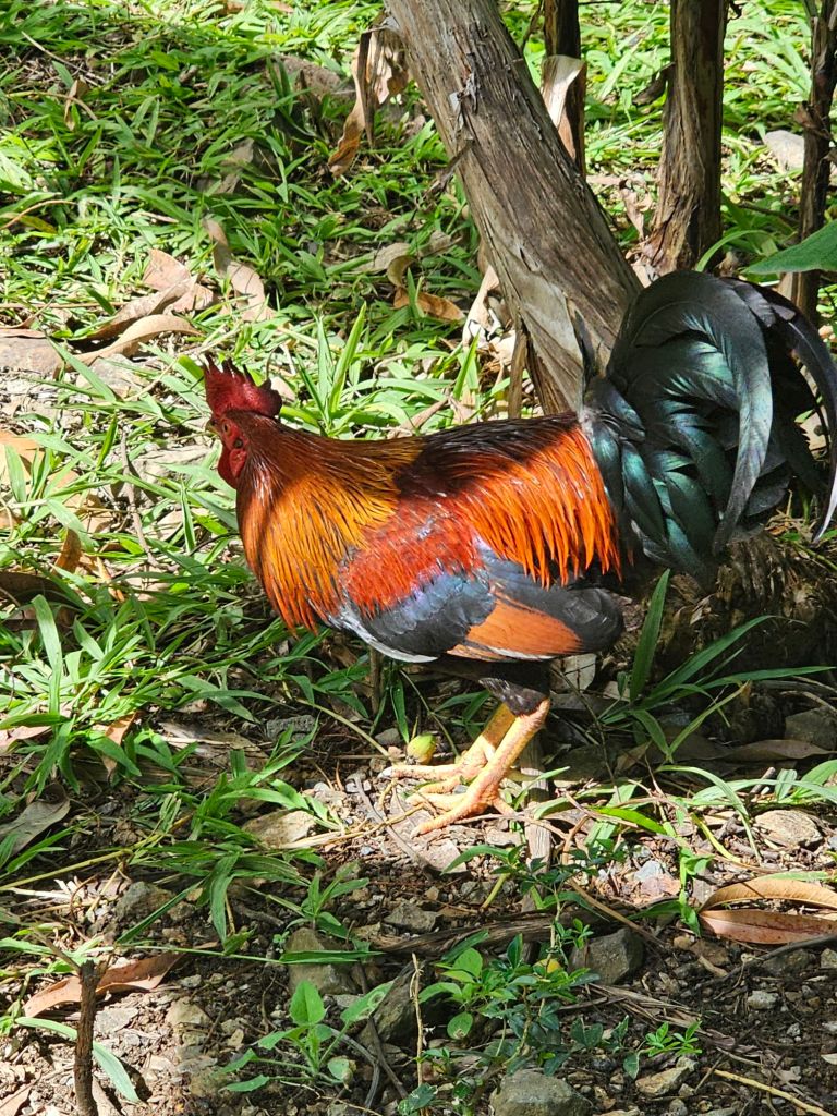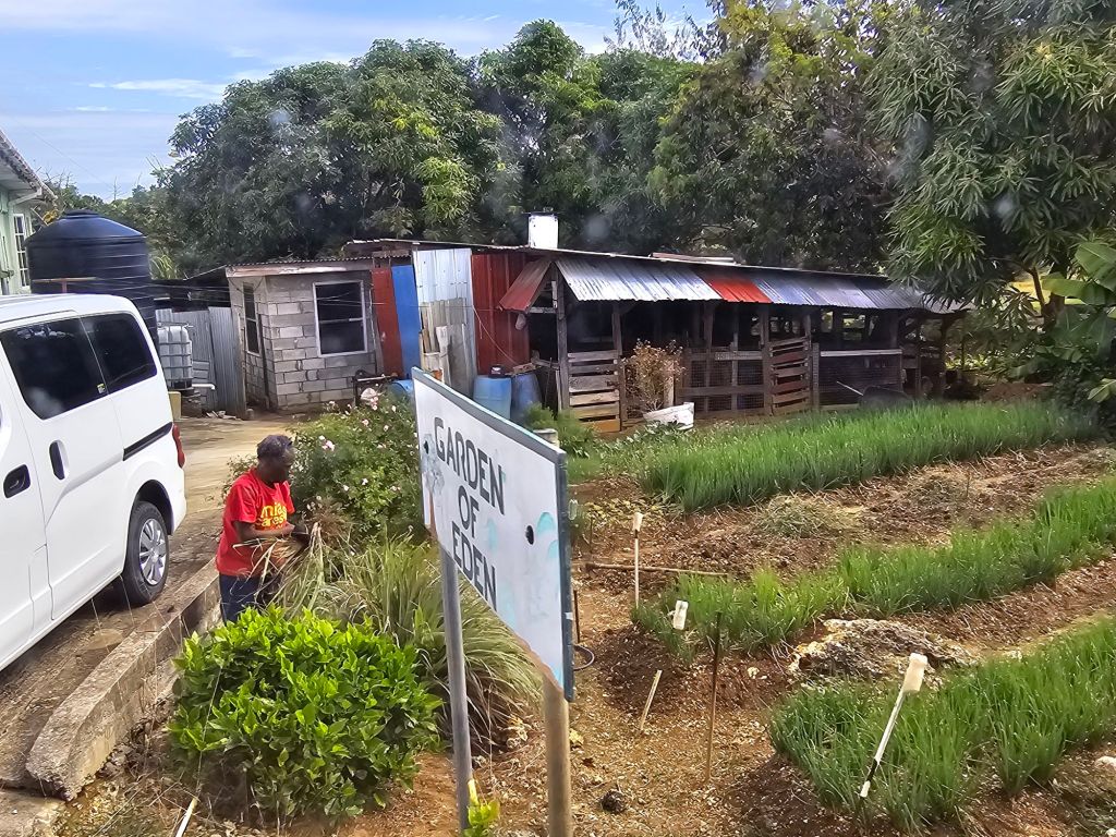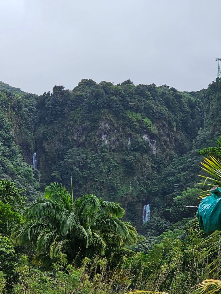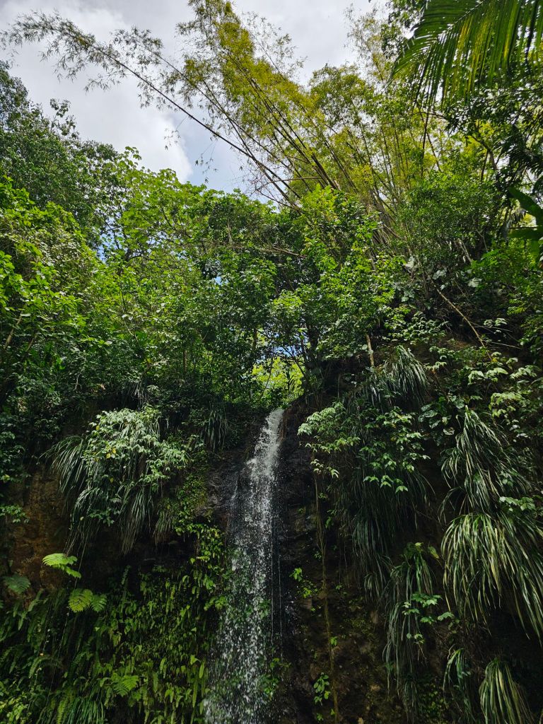Nachdem mein Ausflug von Jungle Tours mich (etwas später als zur angegebenen Zeit) ausserhalb des Terminals eingesammelt hat, machten wir uns mit zwei Fahrzeugen auf den Weg. Ich hatte den Beifahrersitz im kleineren der beiden Fahrzeuge und zusammen mit einer Familie aus New Jersey, die wie anderen Teilnehmenden mit der Odyssey of the Sea unterwegs waren, kämpften wir uns erstmal durch die morgentliche Rush Hour. Erster Stop war eine genossenschaftlich betriebene Bananenplantage. Bananen – zum Essen wie zum Kochen – sind eines der Hauptprodukte der Insel. Wir haben eine Banane frisch vom Baum probiert und einiges über den Anbau erfahren.