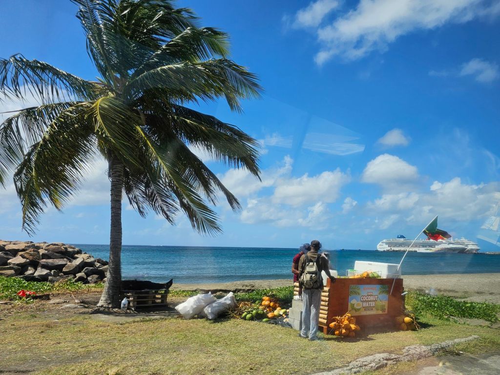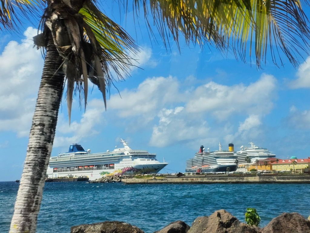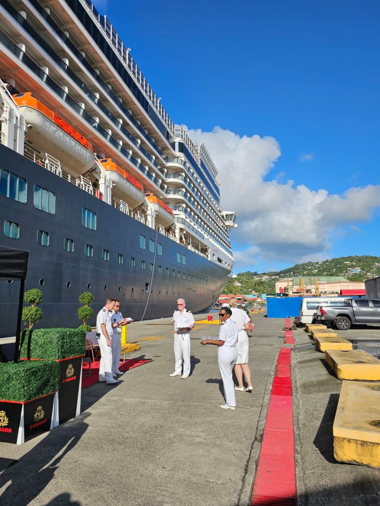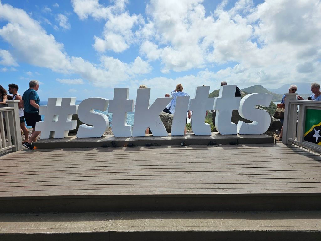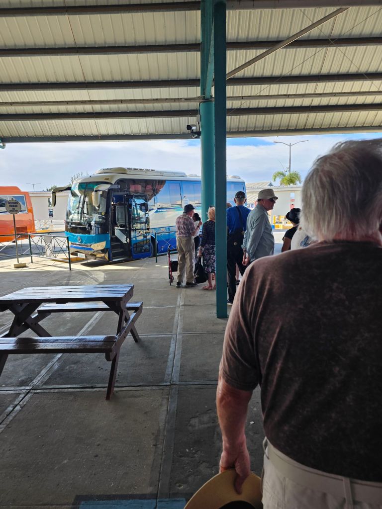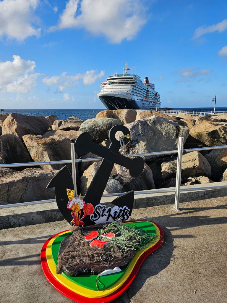 Da ich einen früh startenden Ausflug – gebucht über Cunard – mit dem schönen Titel „Easy St.Kitts“ hatte, war ich eine der ersten, die nach einem frühen Kabinenfrühstück das Schiff verlassen habe und kam auf einen noch ruhigen Pier. St. Kitts und Nevis https://de.wikipedia.org/wiki/St._Kitts_und_Nevis ist eines der Länder, in denen König Charles III. noch Staatsoberhaupt des kleinen seit 1983 unabhängigen Staates mit etwas über 51.000 Einwohner*innen auf den beiden zur Föderation gehörenden Inseln ist. Im Oktober 2025 hat das Land auch ein eigenes ETA, das rund 20 $ kostet, eingeführt, hat aber für Kreuzfahrttagesgäste Sonderregelungen: diese müssen neben der Schiffskarte auch einen amtlichen Lichtbildausweis (mein Personalausweis war ausreichend) vorlegen.